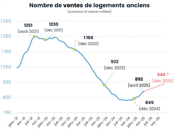 Après trois années marquées par un net recul de l’activité (-33 % de ventes dans l’ancien entre 2021 et 2024), le marché immobilier montre des signes de redressement. Les ventes de logements anciens sont en hausse de 2,5% sur un an à fin avril 2025, à 892 000 actes signés. Elles se redressent depuis octobre. La FNAIM anticipe 940 000 ventes pour l’année 2025, soit une hausse de +11 % sur un an, selon la nouvelle méthodologie de l’Insee.
