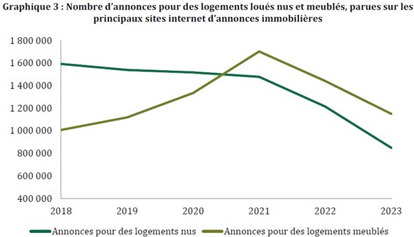 Le marché de la location se tend fortement. L’offre locative chute, notamment dans les grandes villes, avec une montée en puissance des meublés longue durée au détriment des locations nues. Les logements trouvent preneur plus vite (15 jours en moyenne en 2023, contre 21 en 2019) tandis que les locataires restent plus longtemps en place, réduisant la fluidité du marché.