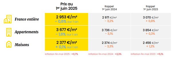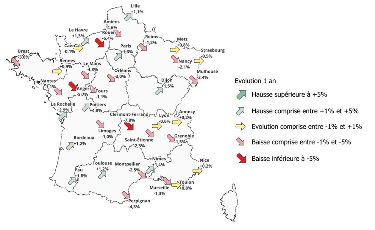 Les prix, en baisse depuis début 2023, ont ralenti leur chute : -0,6 % sur un an à juin 2025, contre -3,2% en juin 2024. Sur trois ans les grandes métropoles restent en repli marqué : Nantes (-13 %), Lyon (-12 %), Bordeaux (-8 %). À l’inverse, Nice résiste (+7 %).