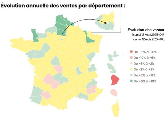 Cette évolution, bien que globalement homogène sur l’ensemble du territoire, connait quelques disparités, à l’image de quelques départements du Nord de la France, où la reprise des ventes est plus importante.