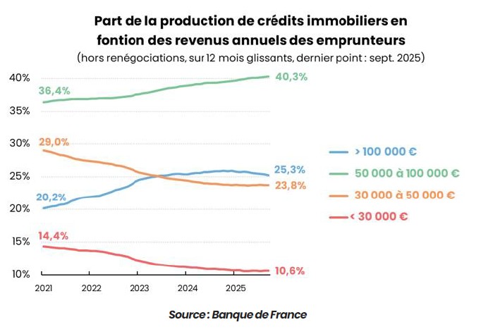 Pour autant, le marché du crédit demeure difficilement accessible pour une grande partie des ménages. Si les primo-accédants sont les principaux bénéficiaires de cette reprise — ils représentent 43,2 % des crédits immobiliers en 2025, contre moins de 30 % il y a cinq ans — l’accès au financement reste majoritairement réservé aux ménages les plus aisés.