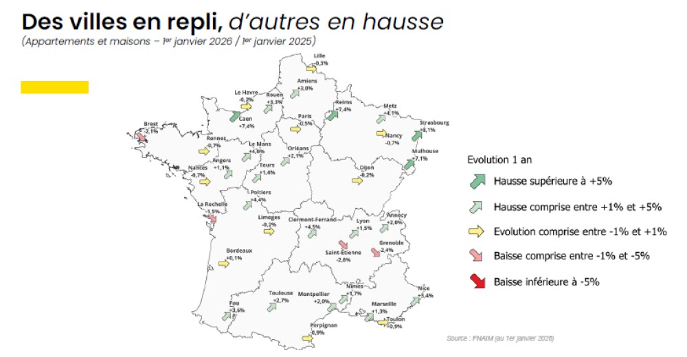 Cette stabilité globale masque toutefois des situations locales contrastées. Certaines villes enregistrent encore des baisses modérées, comme Saint-Étienne (-2,8 %), Grenoble (-2,4 %) ou Brest (-2,1 %), tandis que d’autres affichent des hausses nettement supérieures à la moyenne nationale, notamment Strasbourg (+8,1 %), Mulhouse (+7,1 %), Caen (+7,4 %) ou Reims (+7,4 %).