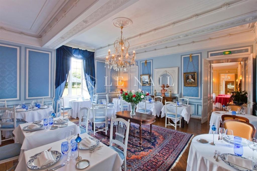 Sur la gauche, un espace de réception mène à deux vastes salles en enfilade, aujourd’hui aménagées en salles à manger. Richement décorées, elles offrent de très beaux parquets, des cheminées en marbre, des boiseries ainsi que de hauts plafonds à caissons décoratifs et moulurés. Traversantes et lumineuses, ces pièces s’ouvrent sur la terrasse.