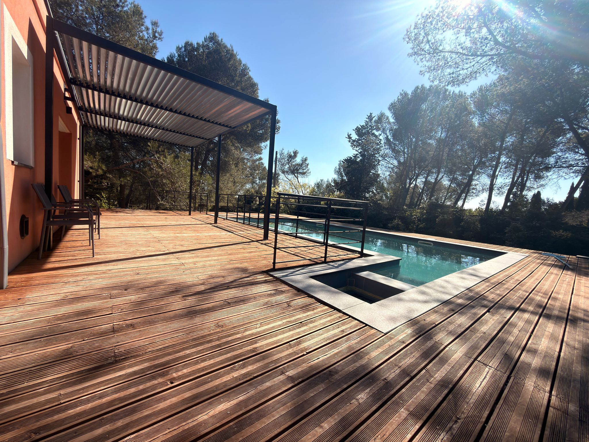 Nous avons le plaisir de vous proposer cette villa contemporaine, à proximité immédiate du Bois des Espeisses, édifiée en 2007 sur un terrain arboré de plus de 3 800 m2. Elle se compose d'une entrée, d'une grande pièce à vivre avec cuisine ouverte, donnant sur une terrasse avec pergola face à la piscine.