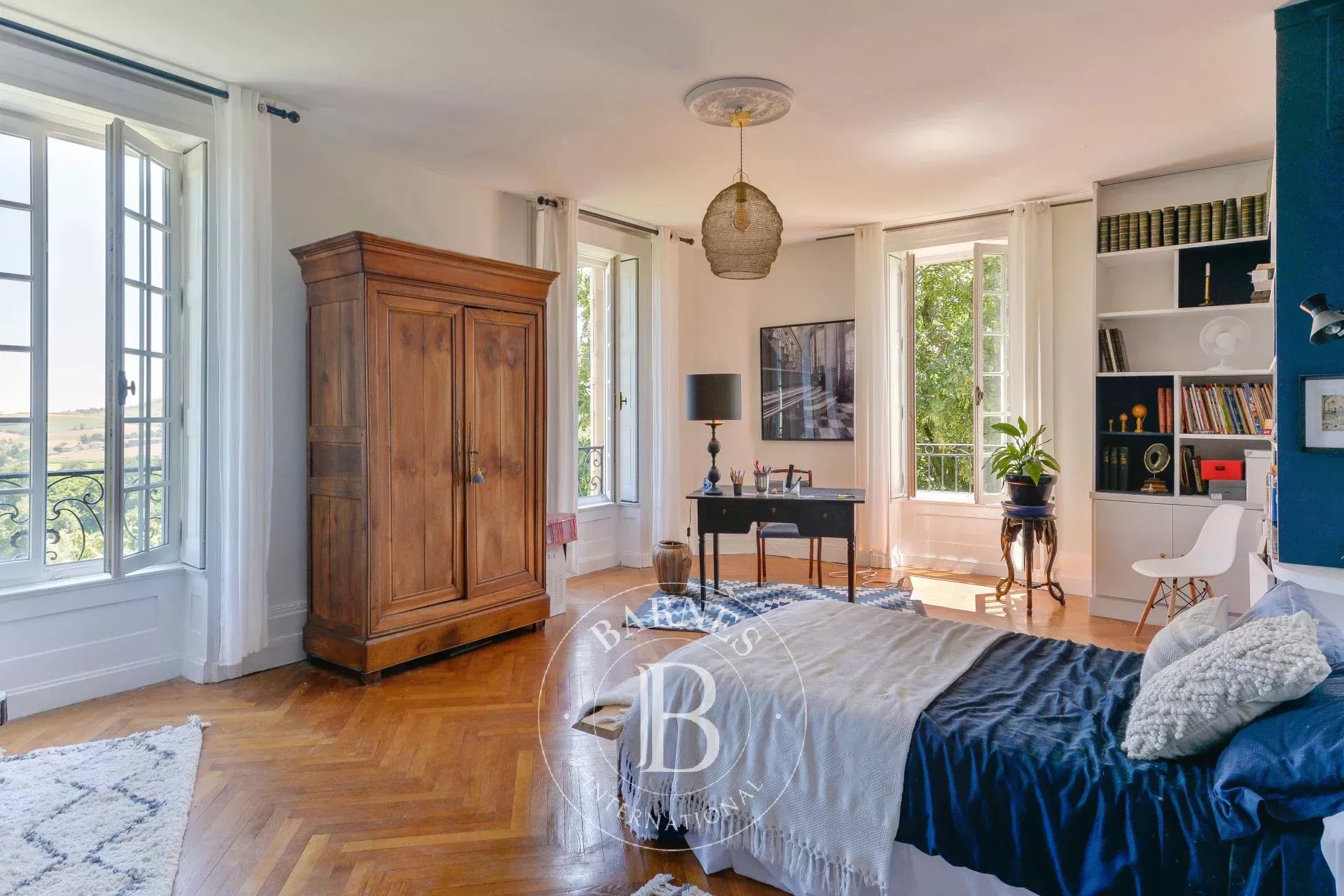 Les étages supérieurs offrent sept grandes chambres, deux salles de bains et trois salles d’eau, aux beaux volumes et éléments anciens préservés : parquets, boiseries, moulures et cheminées d’époque.