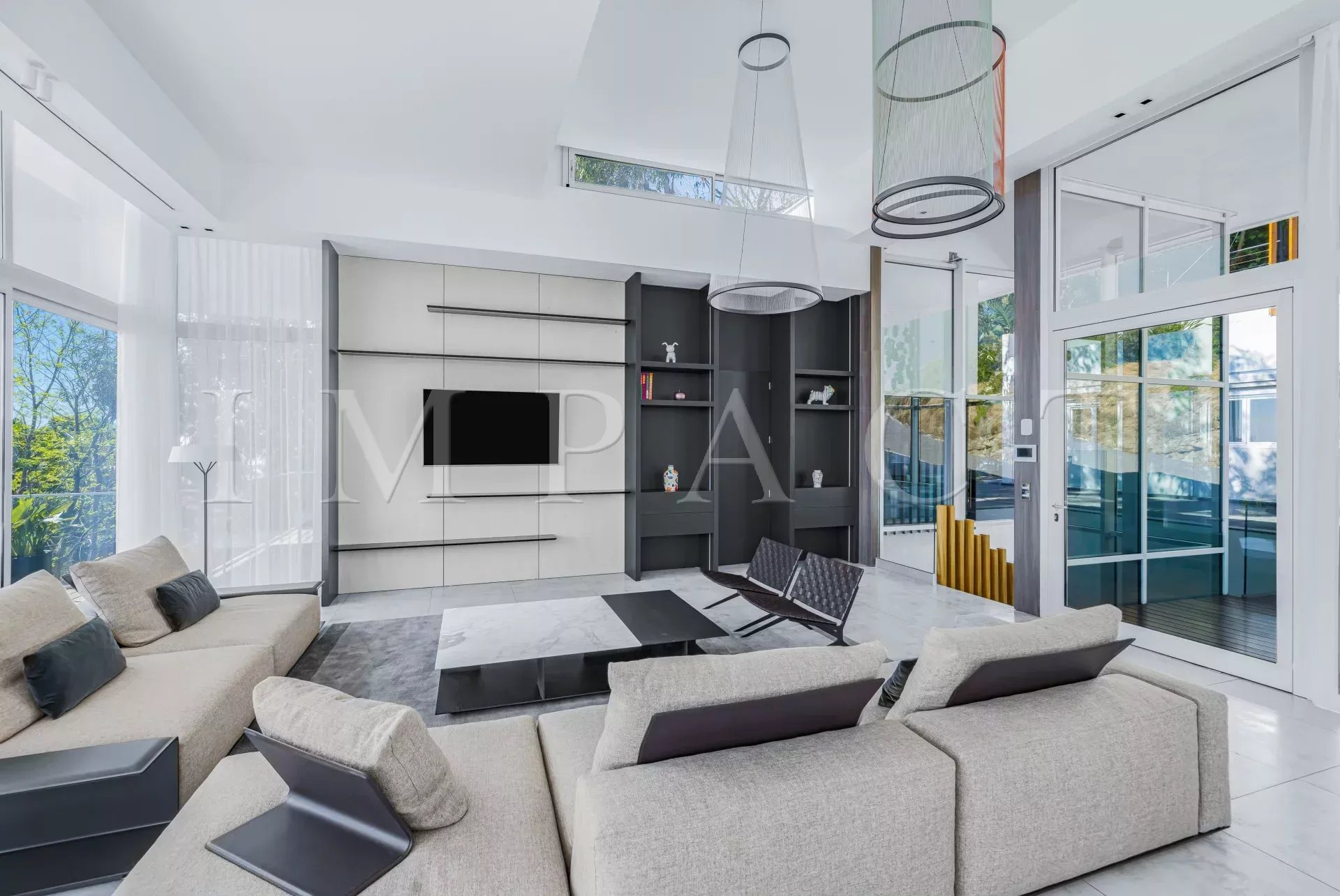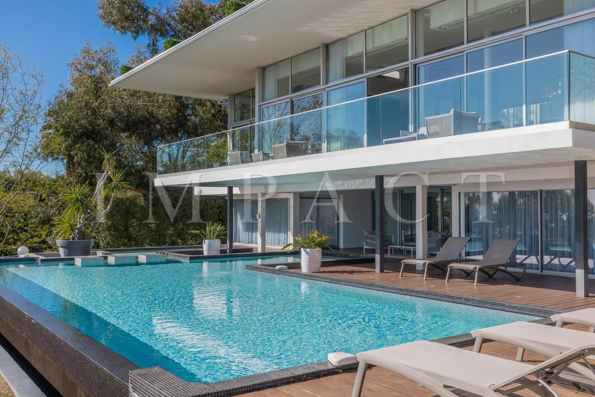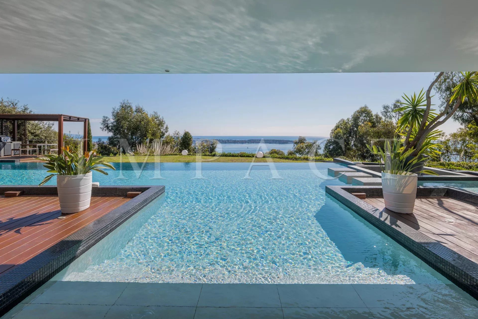 Au cœur du domaine du Super Cannes, superbe villa contemporaine d'architecte d'une surface de 428m² sise sur un terrain paysager d'environ 2 500m² surplombant les îles de Lérins et le Cap d'Antibes, au calme absolu.