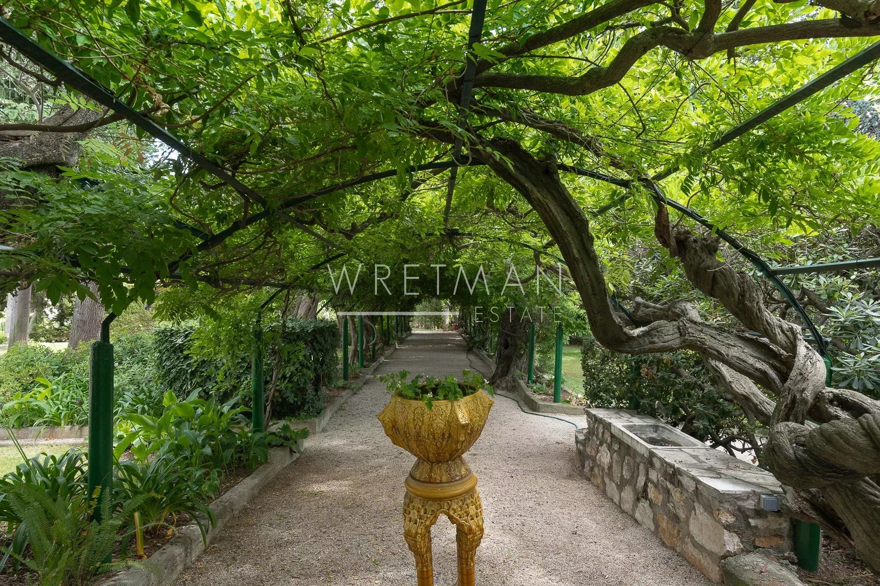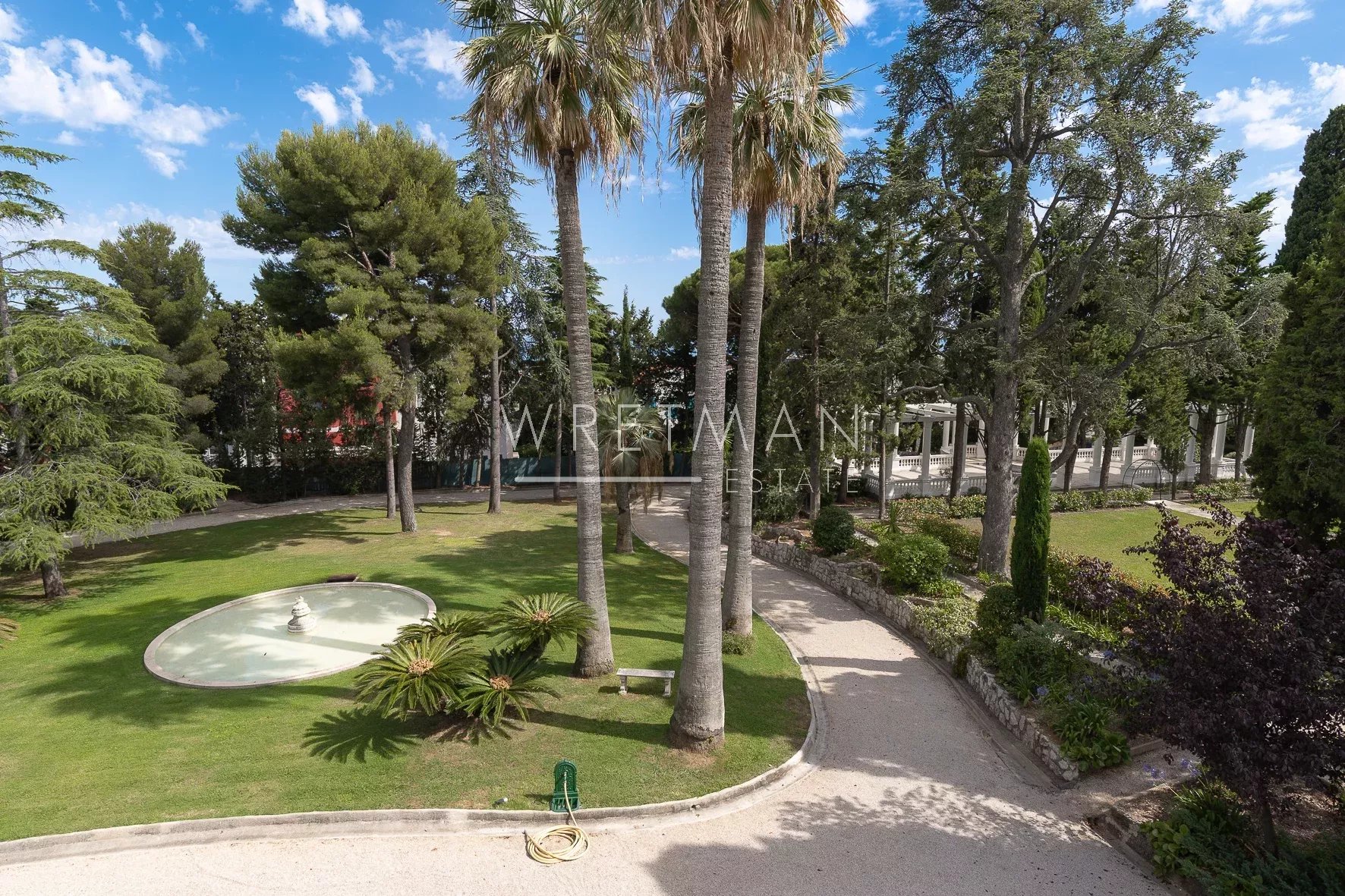 Cette demeure fin XIXe - début XXe vous accueille avec un vaste parc arboré de palmiers, agrémenté d'une fontaine et d'une majestueuse terrasse surplombant l'espace vert, tandis que deux temples de style grec ajoutent une touche de charme.