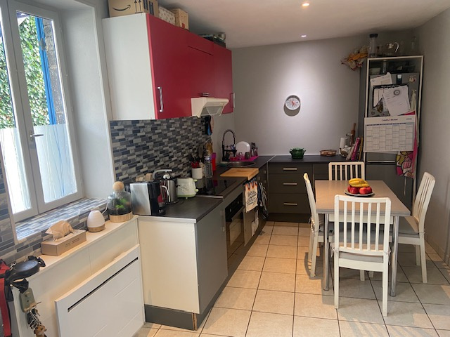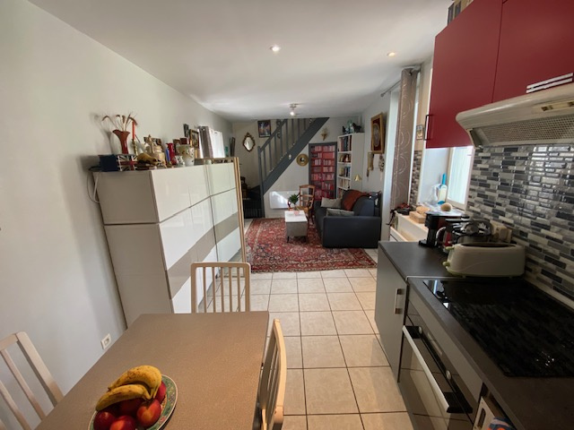 -Au RDC : entrée/cuisine équipée/séjour d'environ 19 M2 (en éléments de rangements et appareils électro-ménagers) + WC.