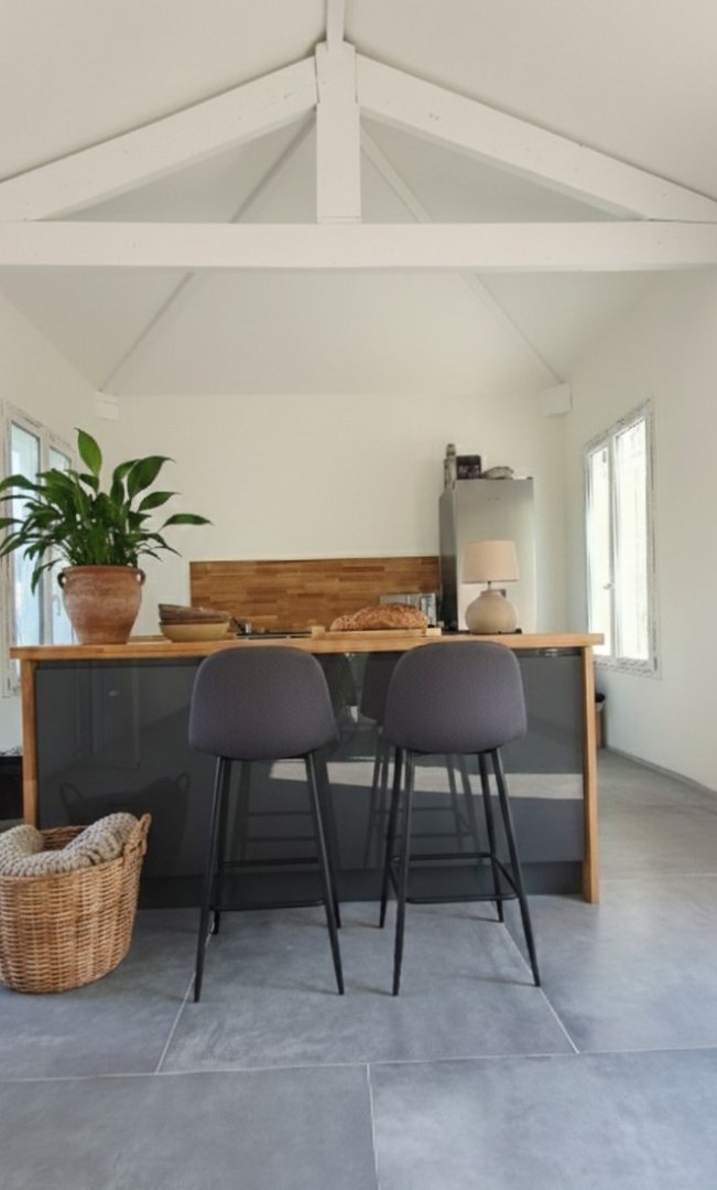 L'espace de vie, composé d'une cuisine ouverte, d'une salle à manger et d'un séjour spacieux, offre un volume magistral et une atmosphère inspirante.