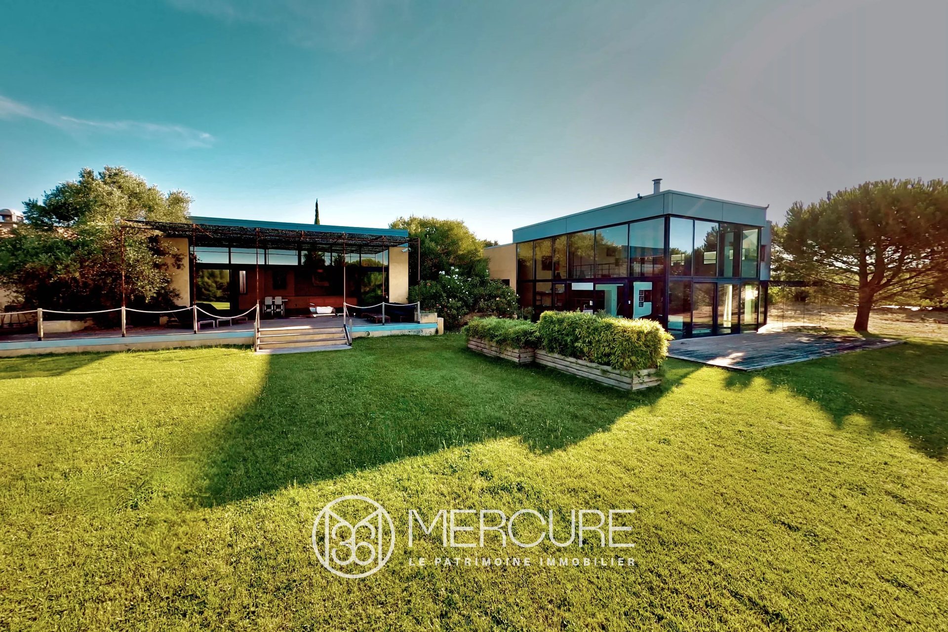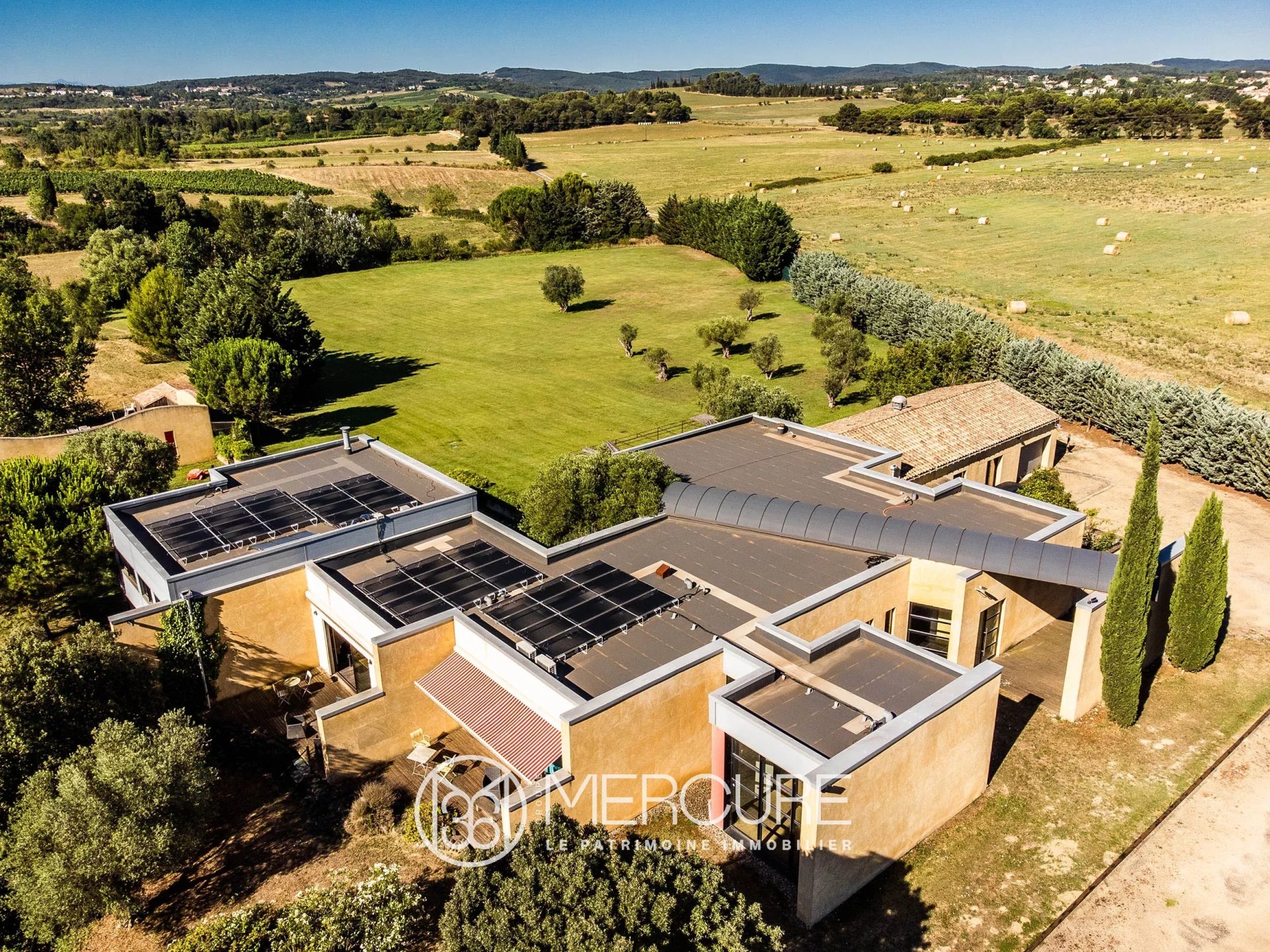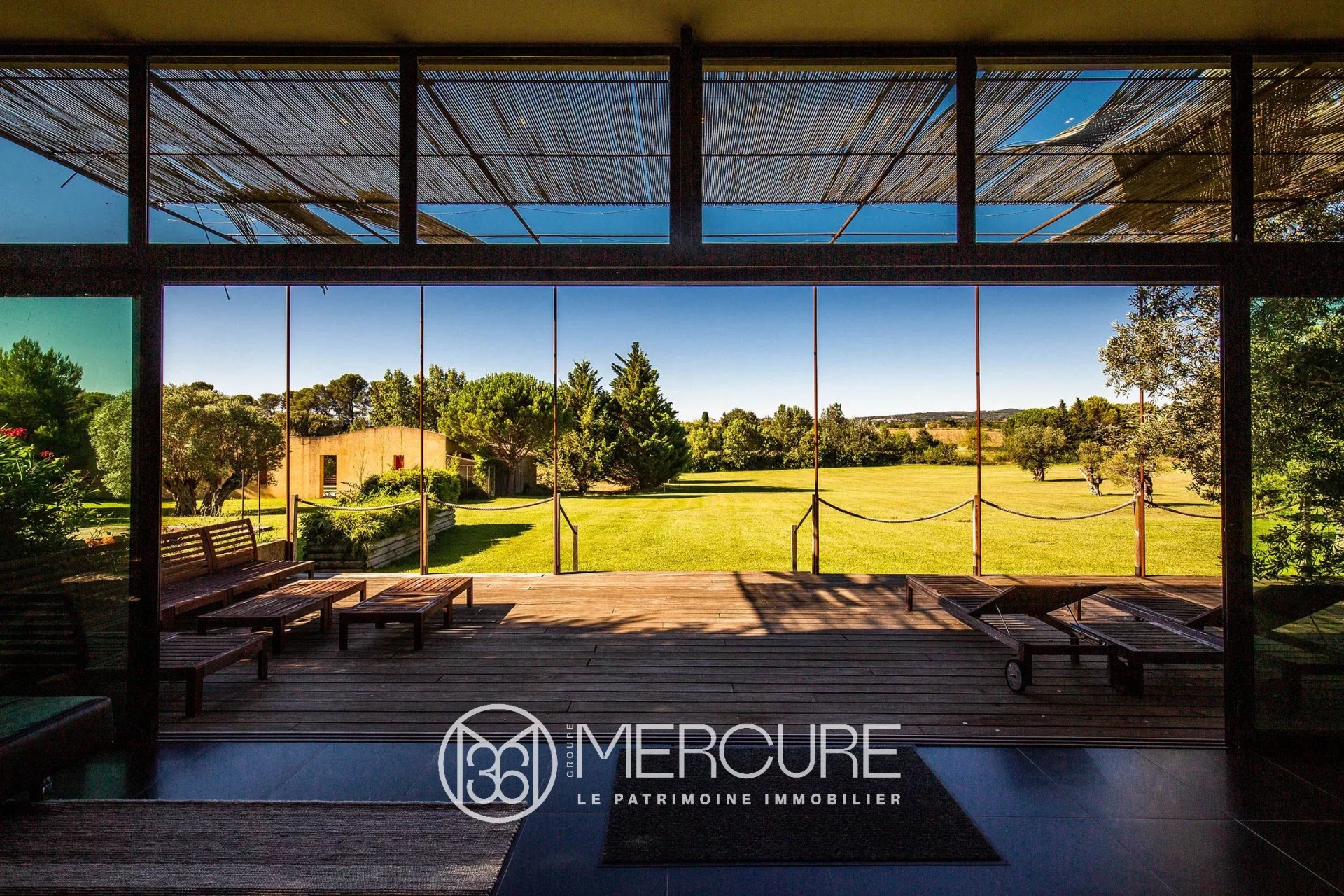Lumineuse villa d'architecte en pierre du Gard, sur 600 m² habitables et plus de 2 hectares de jardin arboré avec vue. En périphérie d'un village et d'un lac, avec piscine et panneaux solaires. A 5 minutes d'une grande ville touristique avec aéroport, et gare à proximité.