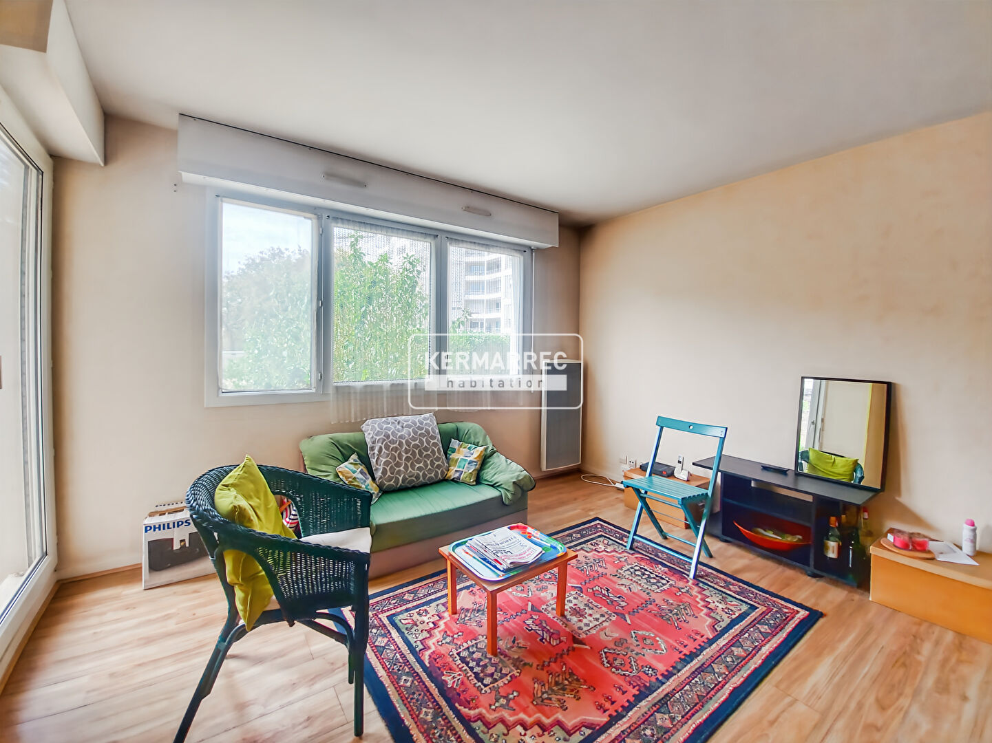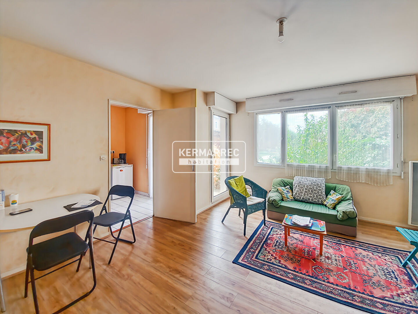 KERMARREC Habitation vous propose en EXCLUSIVITÉ ce spacieux 2 pièces, bénéficiant d'une belle pièce de vie donnant sur une terrasse, une cuisine séparée, une chambre, une salle de bains et un WC.