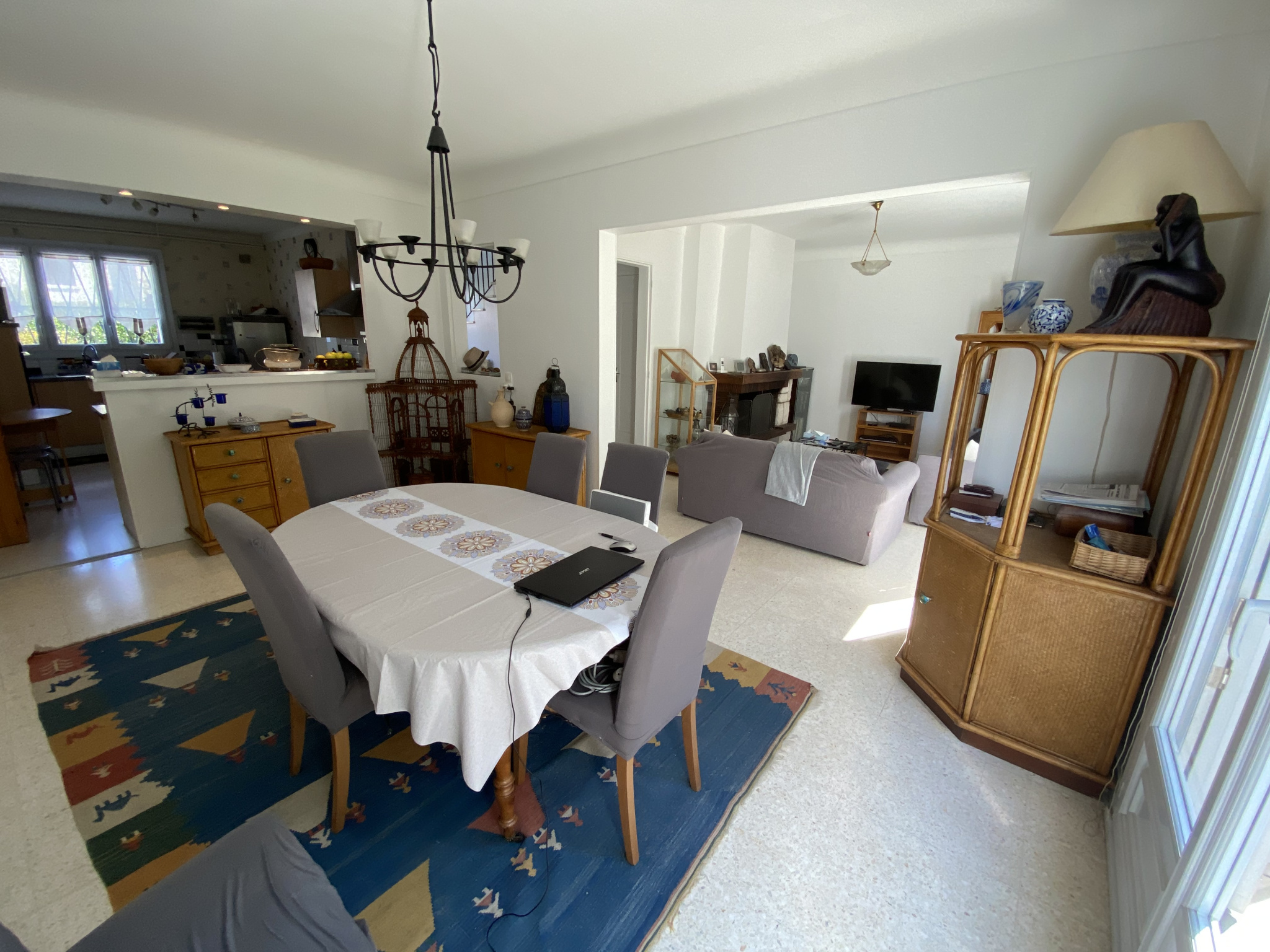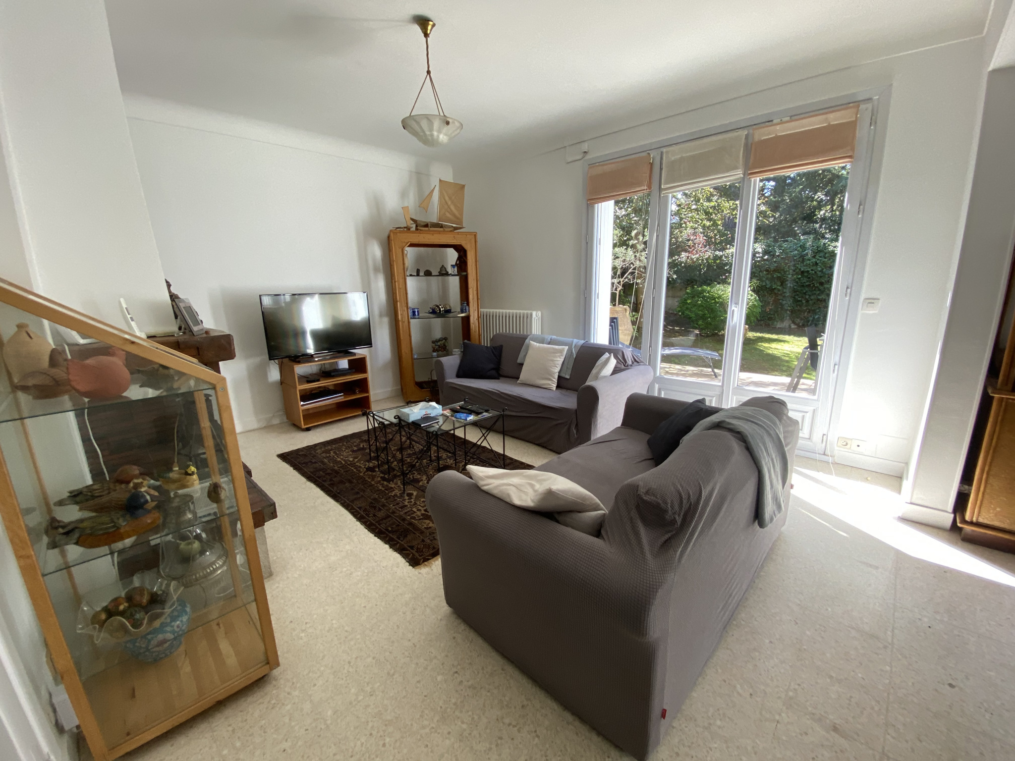 - un hall d'entrée (11,50m2) avec placard, desservant un espace de vie (53,20m2) lumineux sur un joli sol en Terrazzo et équipé d'une cheminée, donnant sur une terrasse carrelée (28m2) avec store motorisé et le jardin paysagé exposition Sud-Ouest.