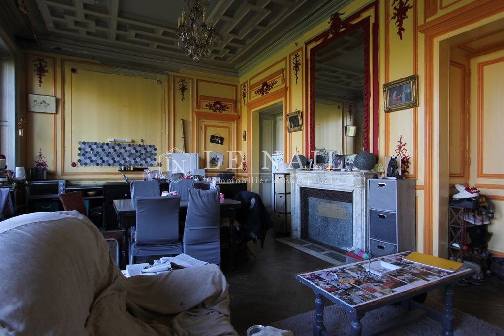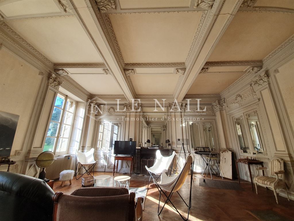Au rez-de-chaussée, au centre de la maison, un vaste hall d’entrée (71m²) distribue les pièces de réception. Ce niveau compte ainsi un salon, une bibliothèque, une très belle salle à manger, une cuisine, quatre petites pièces et wc. Un large escalier en pierre conduit au premier étage qui compte 7 chambres et 6 salles d’eau ou salles de bains.