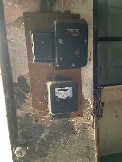 Ancien compteur EDF en place , plus de compteur d'eau , boite de branchement pour tout à l'égout devant la maison.