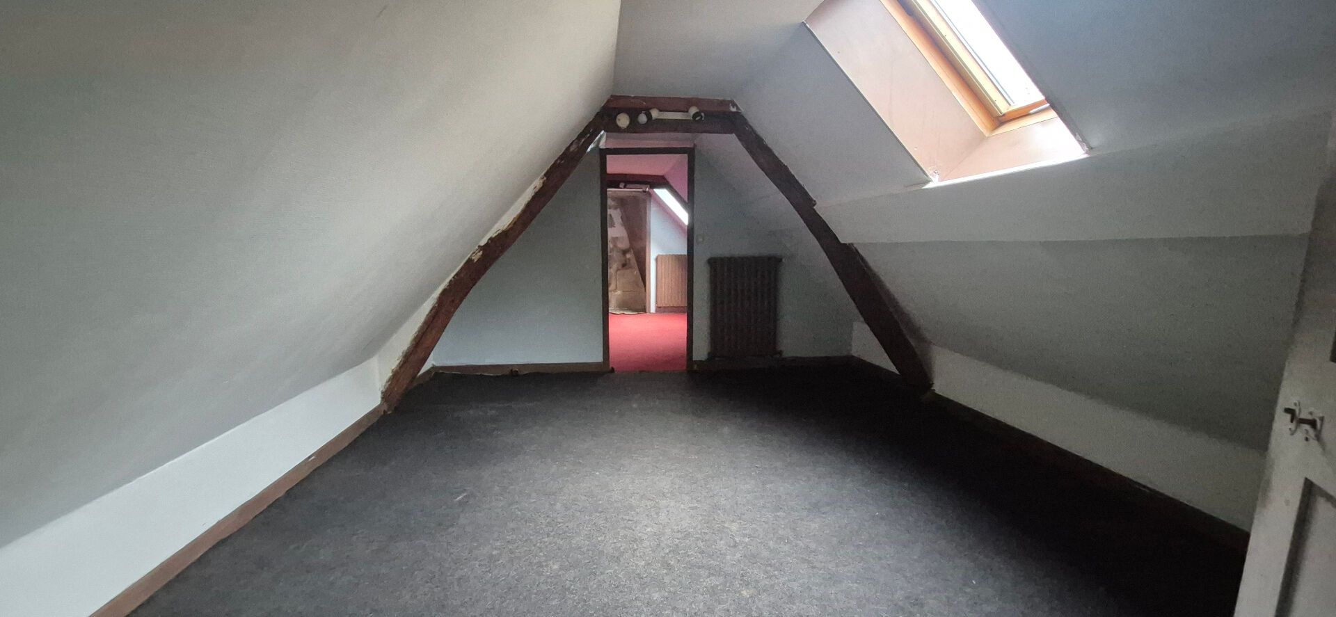 Maison comprenant une entrée sur séjour double et cuisine ouverte, une salle d'eau avec wc. Étage : palier, deux chambres et une salle de bains avec Wc. 2ème étage mansardé : un bureau, une chambre. Cave. Un grand garage, un appentis et un bâtiment. L'ensemble sur 406 m² de terrain clos. Travaux à prévoir