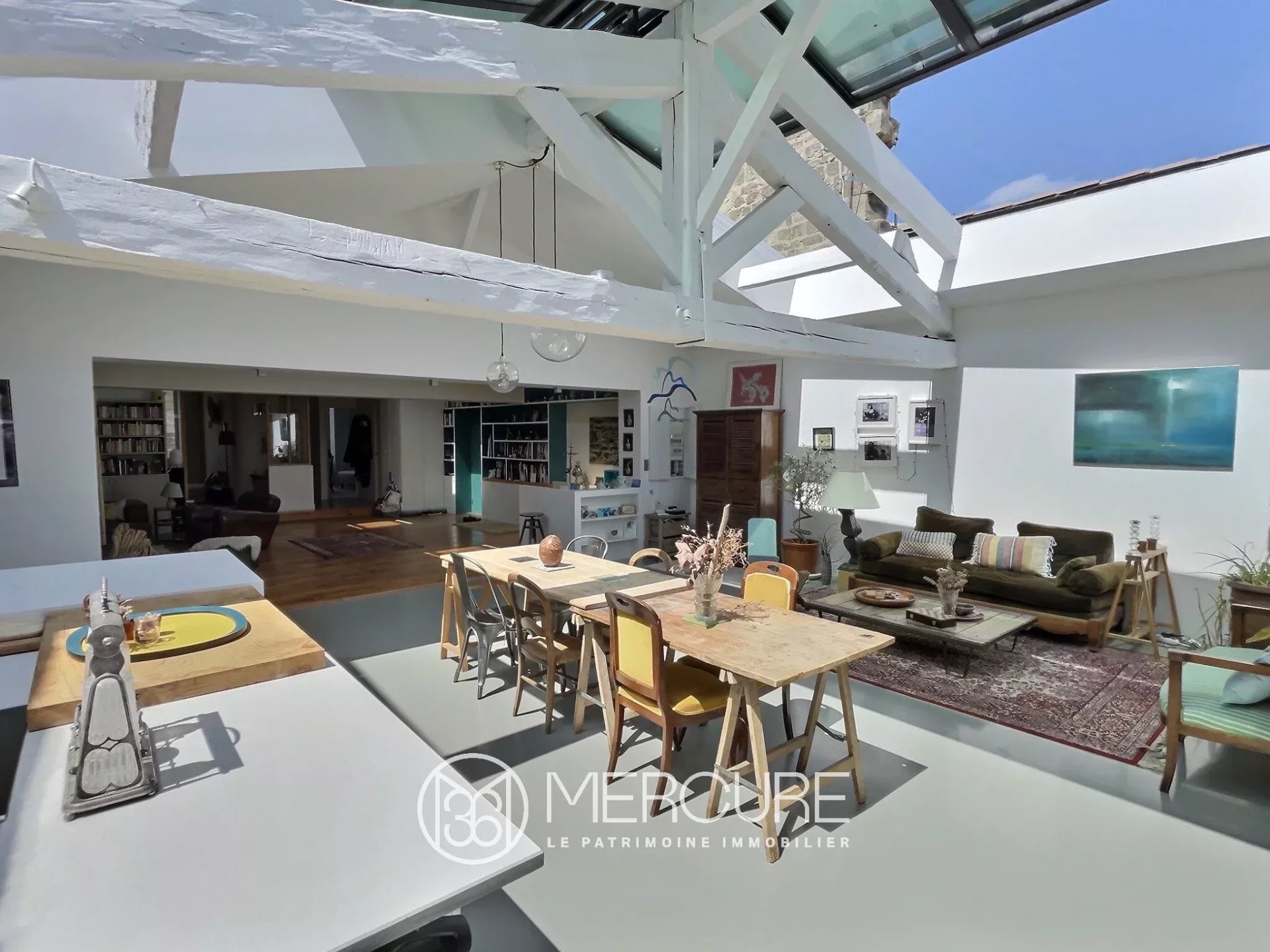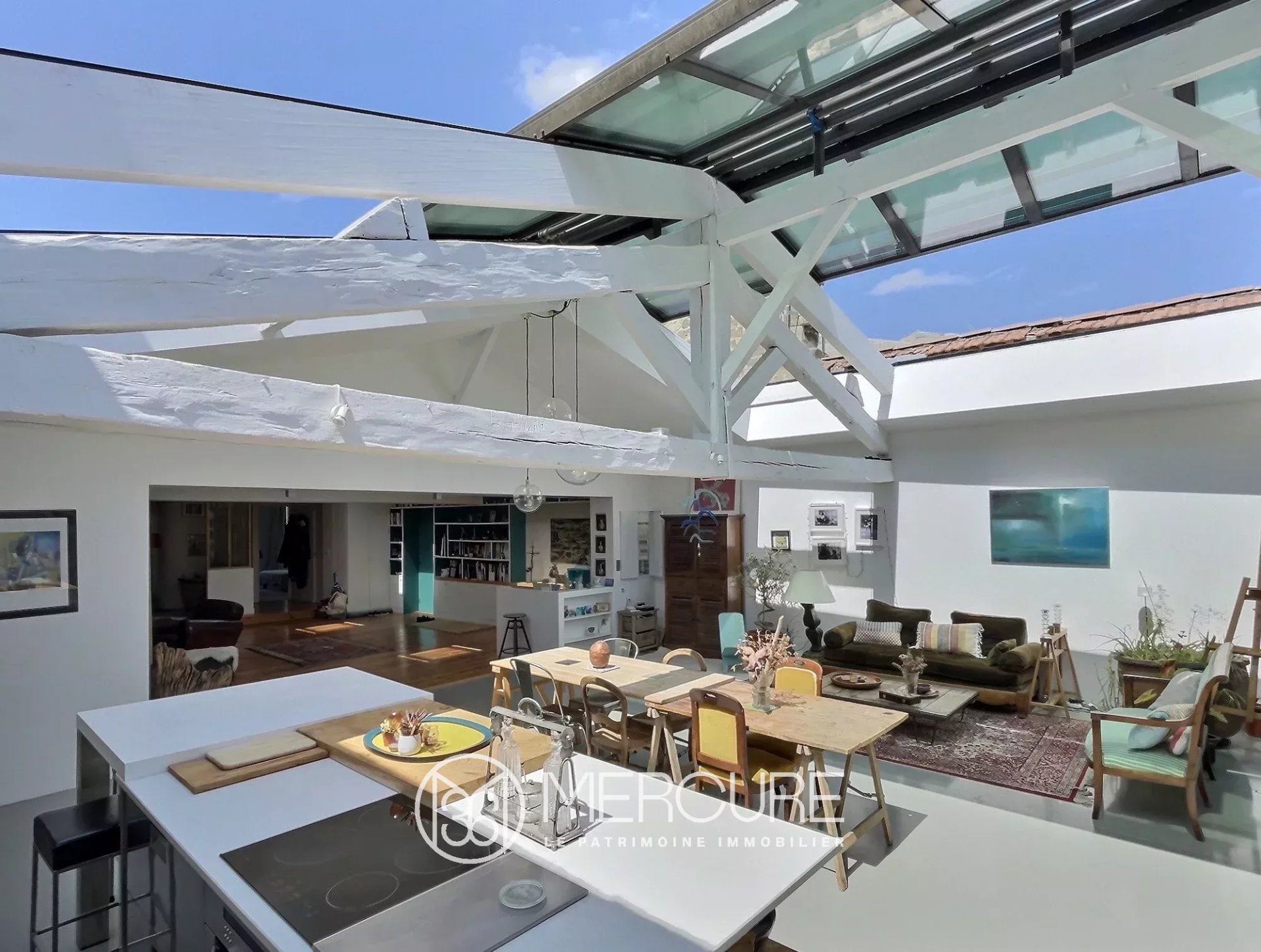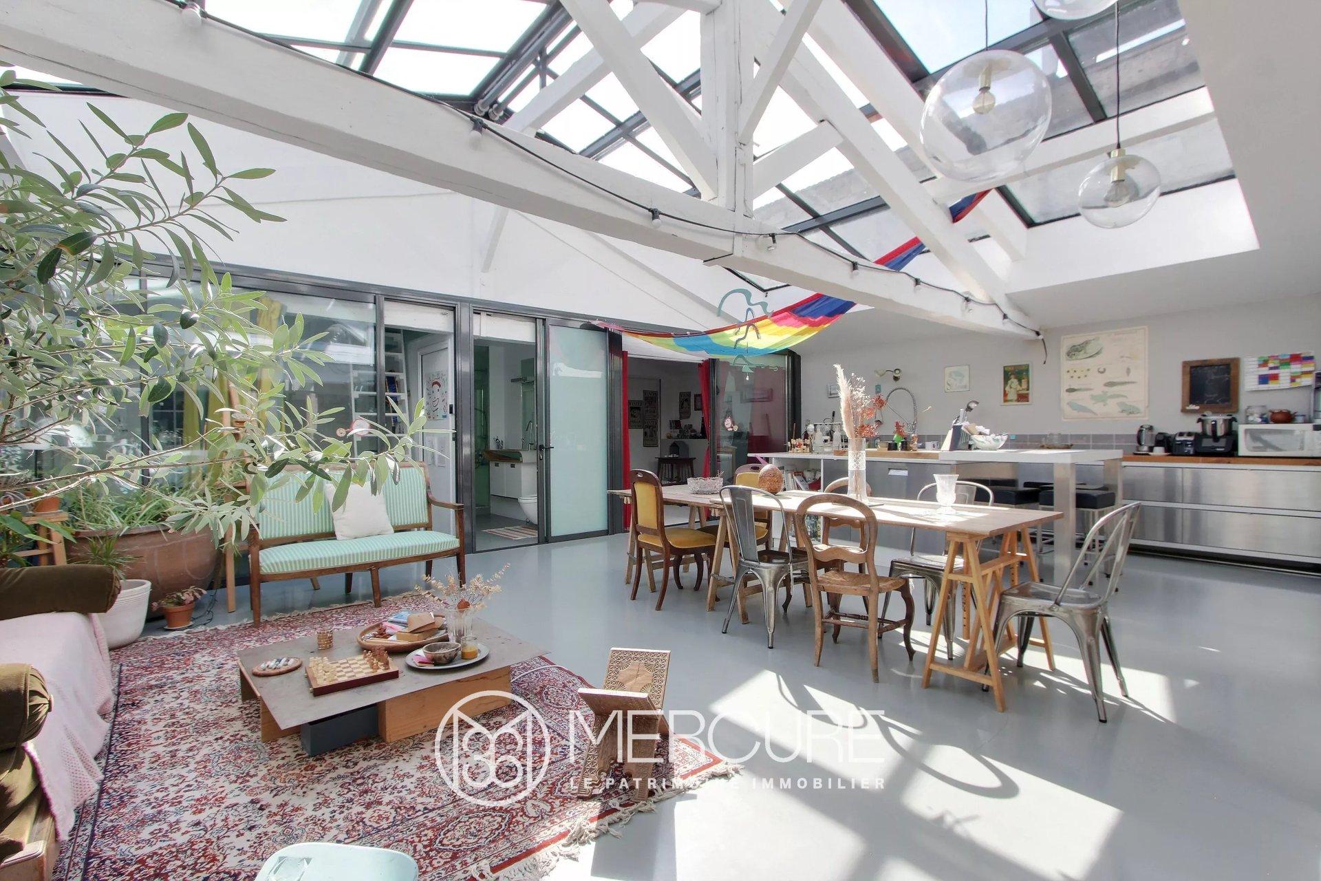 L'espace se distingue par ses volumes généreux et son éclairage naturel exceptionnel, assuré par une verrière rétractable motorisée. La rénovation soignée met en valeur les charpentes apparentes et des aménagements sur-mesure. L'accent a été mis sur l'élégance des matériaux et les détails.