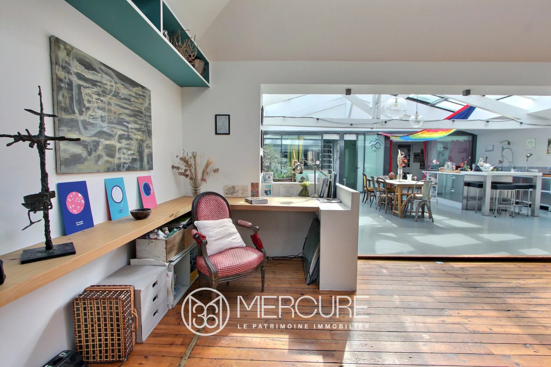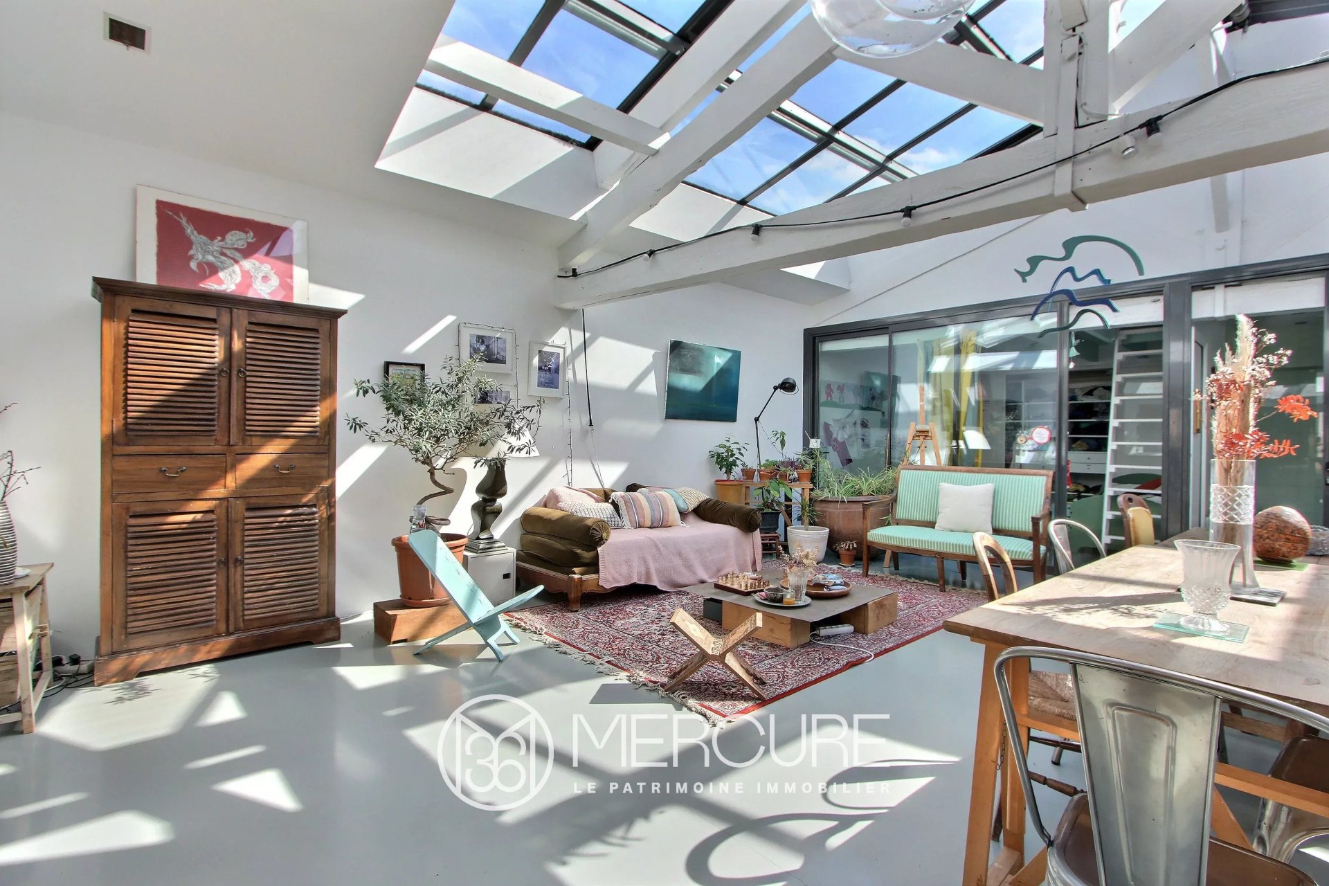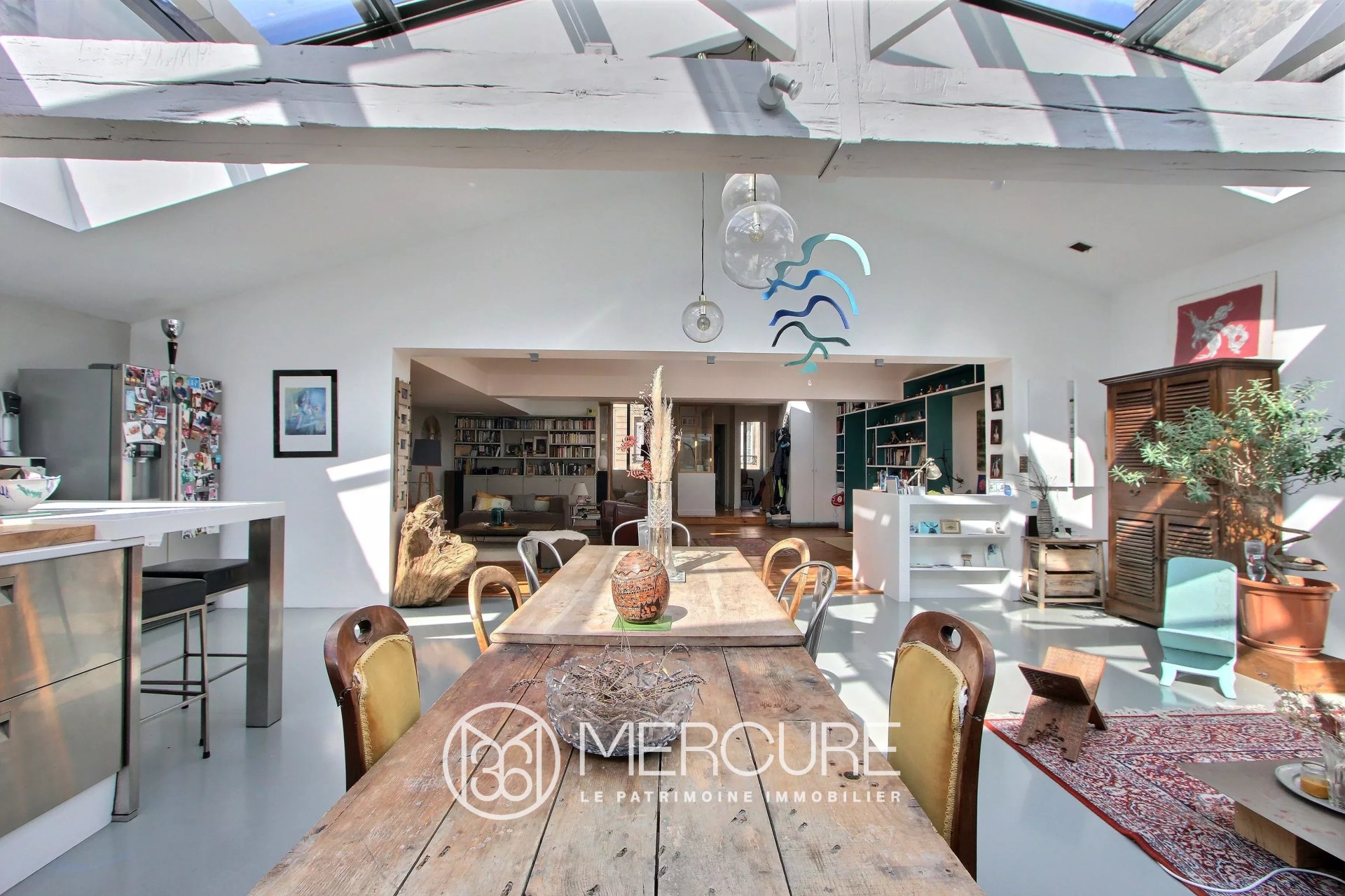 L'espace se distingue par ses volumes généreux et son éclairage naturel exceptionnel, assuré par une verrière rétractable motorisée. La rénovation soignée met en valeur les charpentes apparentes et des aménagements sur-mesure. L'accent a été mis sur l'élégance des matériaux et les détails.