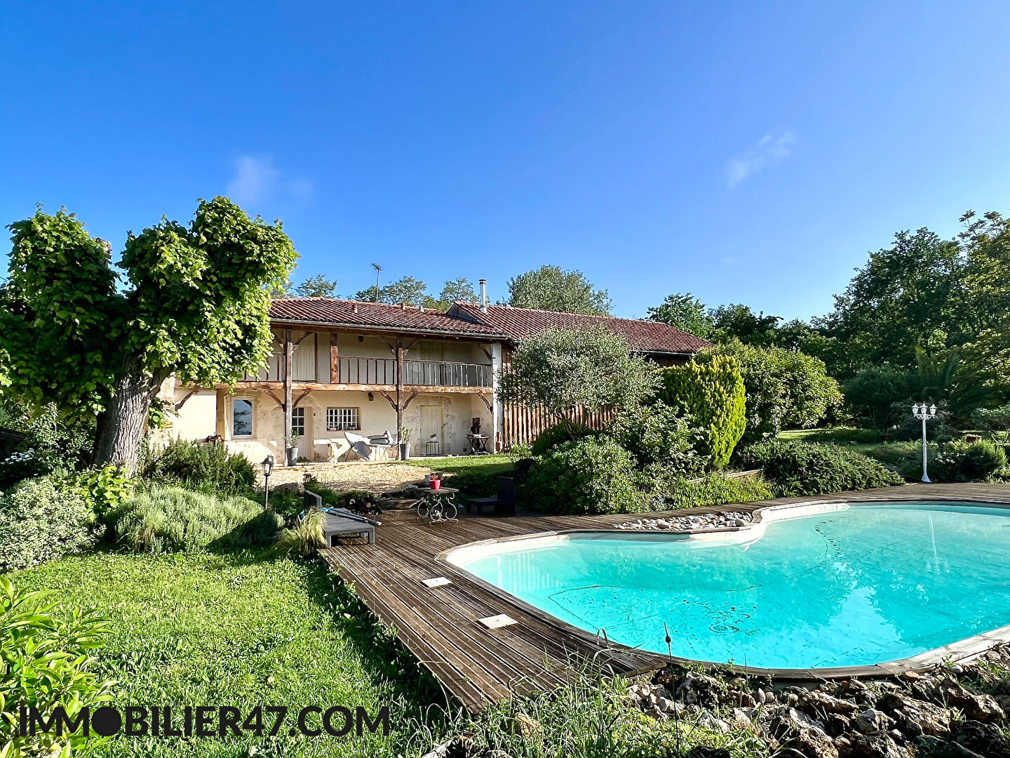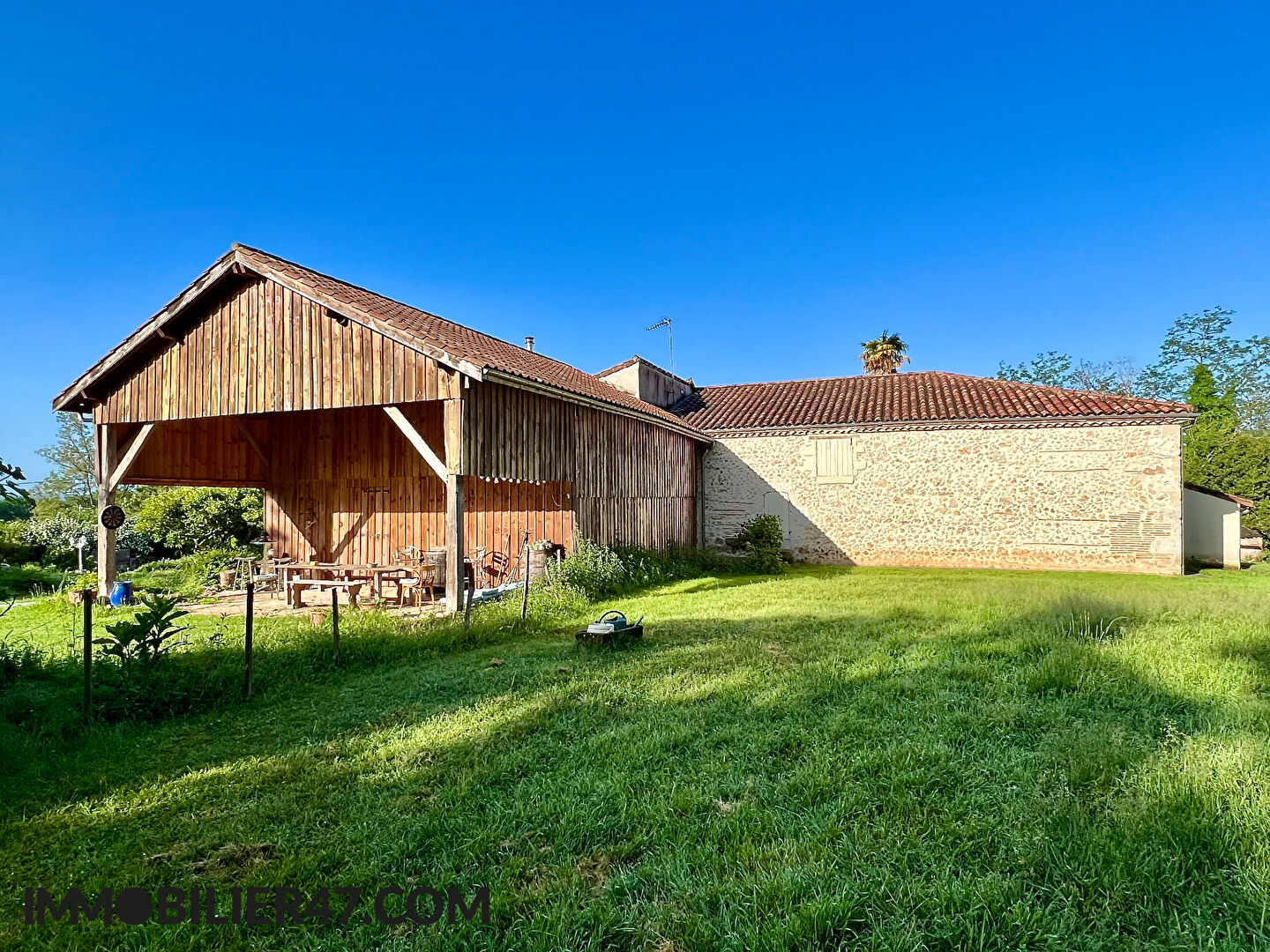 A moins de 5 minutes des commodités de Castelmoron sur Lot, magnifique propriété en pierre en parfait état composée d'une vaste maison, d'une grande grange de 170m2, d'une dépendance de 65m2 ainsi qu'une piscine (bassin de nage). L'habitation developpe environ 280m2, elle est composée de 4 grandes chambres, dont 2 en rez-de-chaussée avec dressing, double séjour et grande cuisine équipée avec poêle à bois. La production de chauffage est réalisée par une chaudière à granules neuve. Le tout sur un parc arboré de prés de 6400m2 dont une partie constructible et équipé d'un puits.