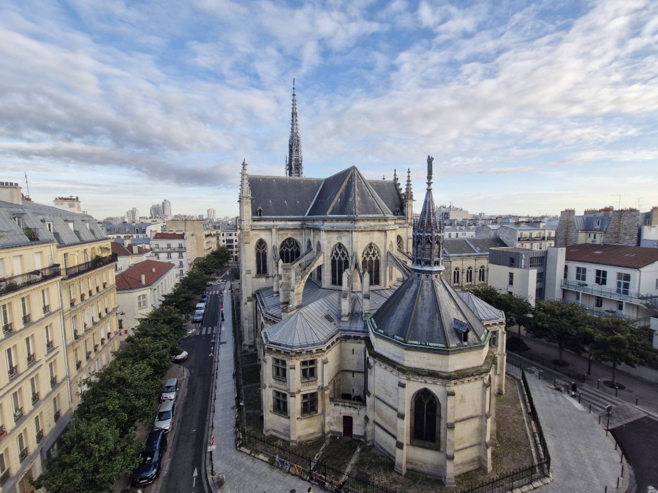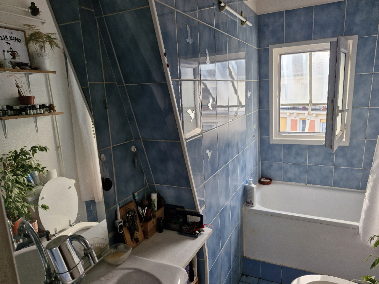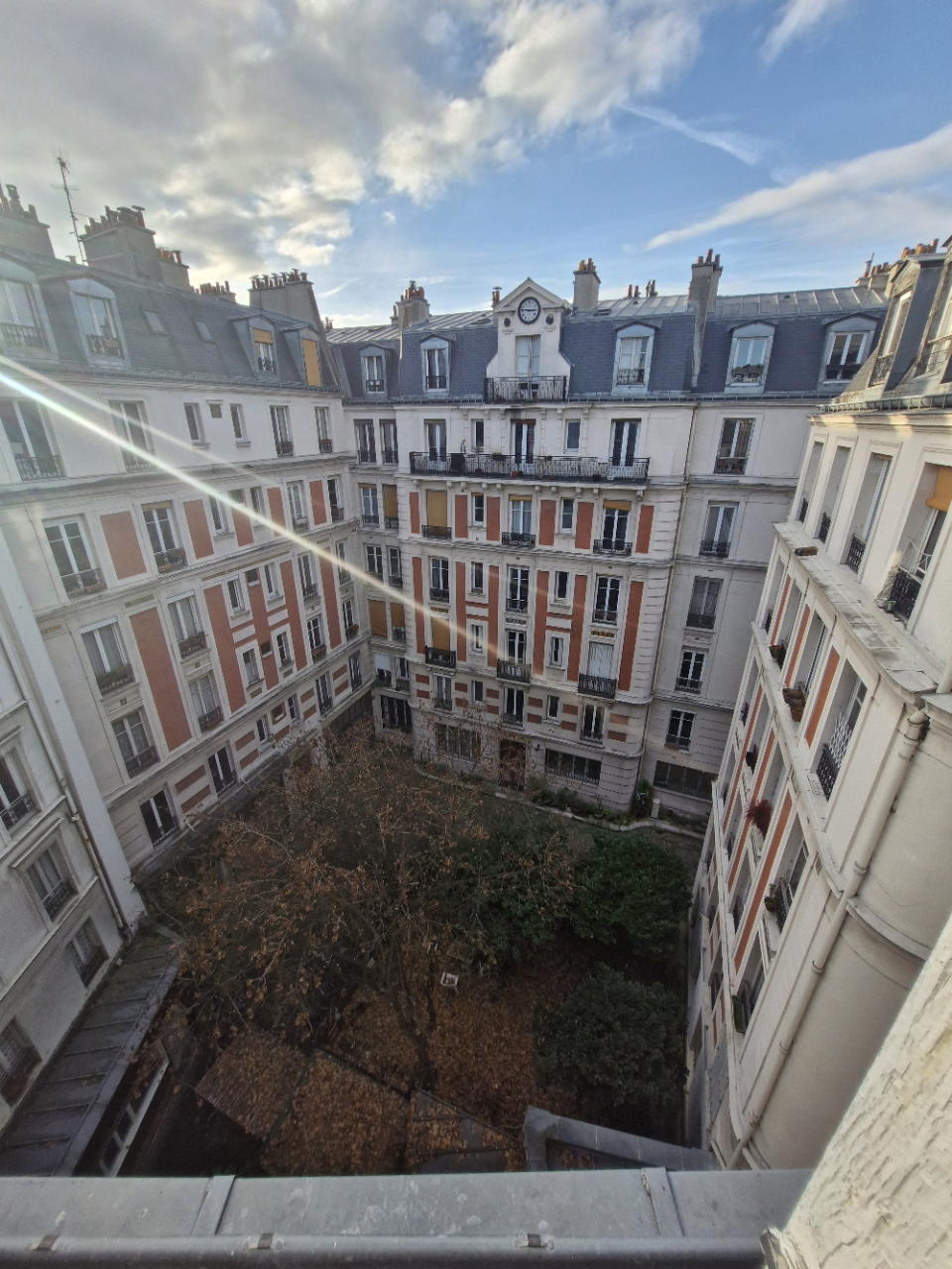 Au 6ème et dernier étage sans ascenseur d'un immeuble bourgeois, studio traversant de 19 m2 carrez divisé en entrée, salle de bain avec wc, cuisine séparée et séjour.
