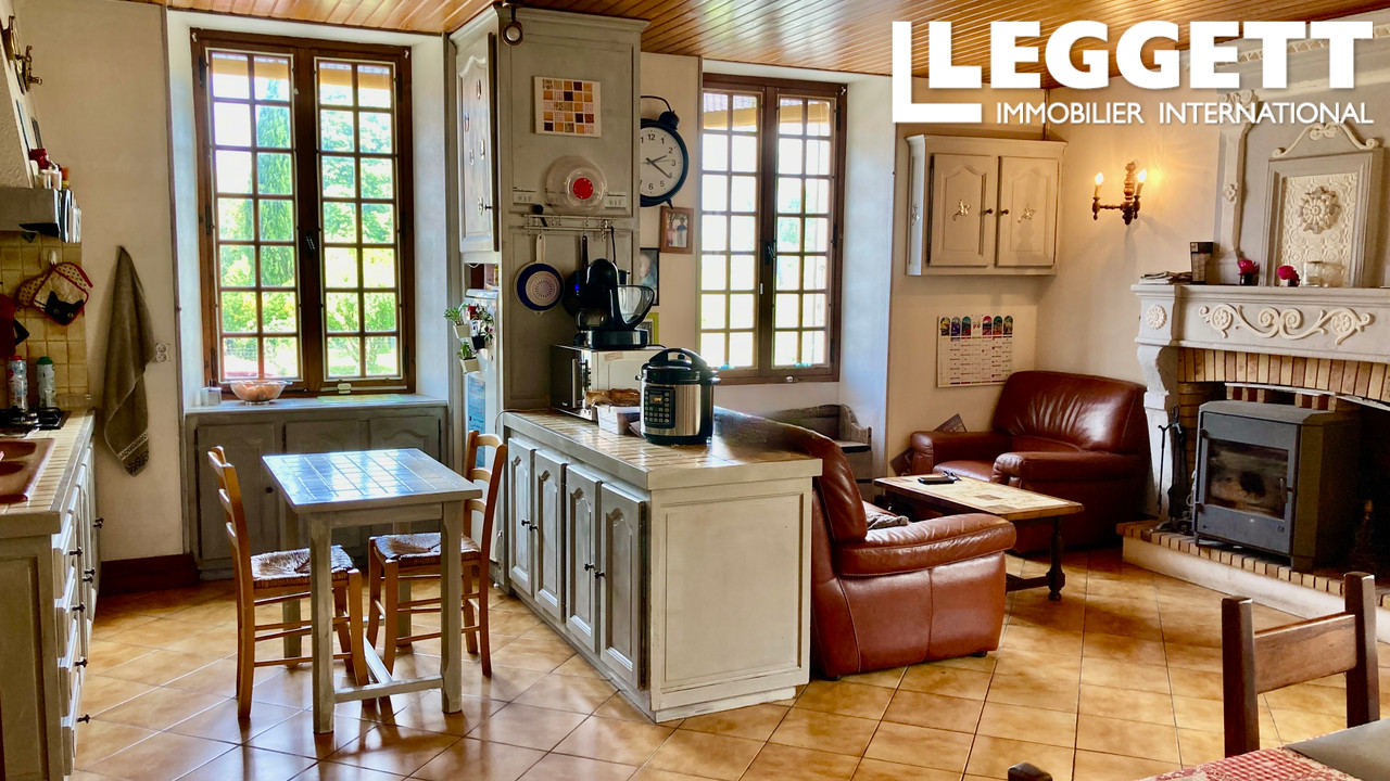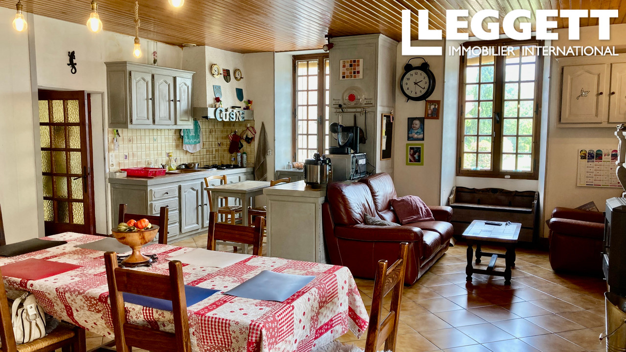 A21320ELM17 - Située dans le sud de la Charente Maritime à 10mn de Jonzac, cette propriété de plain pied vous offre un bel espace de vie et un terrain clos de 6000m² avec de grandes dépendances.