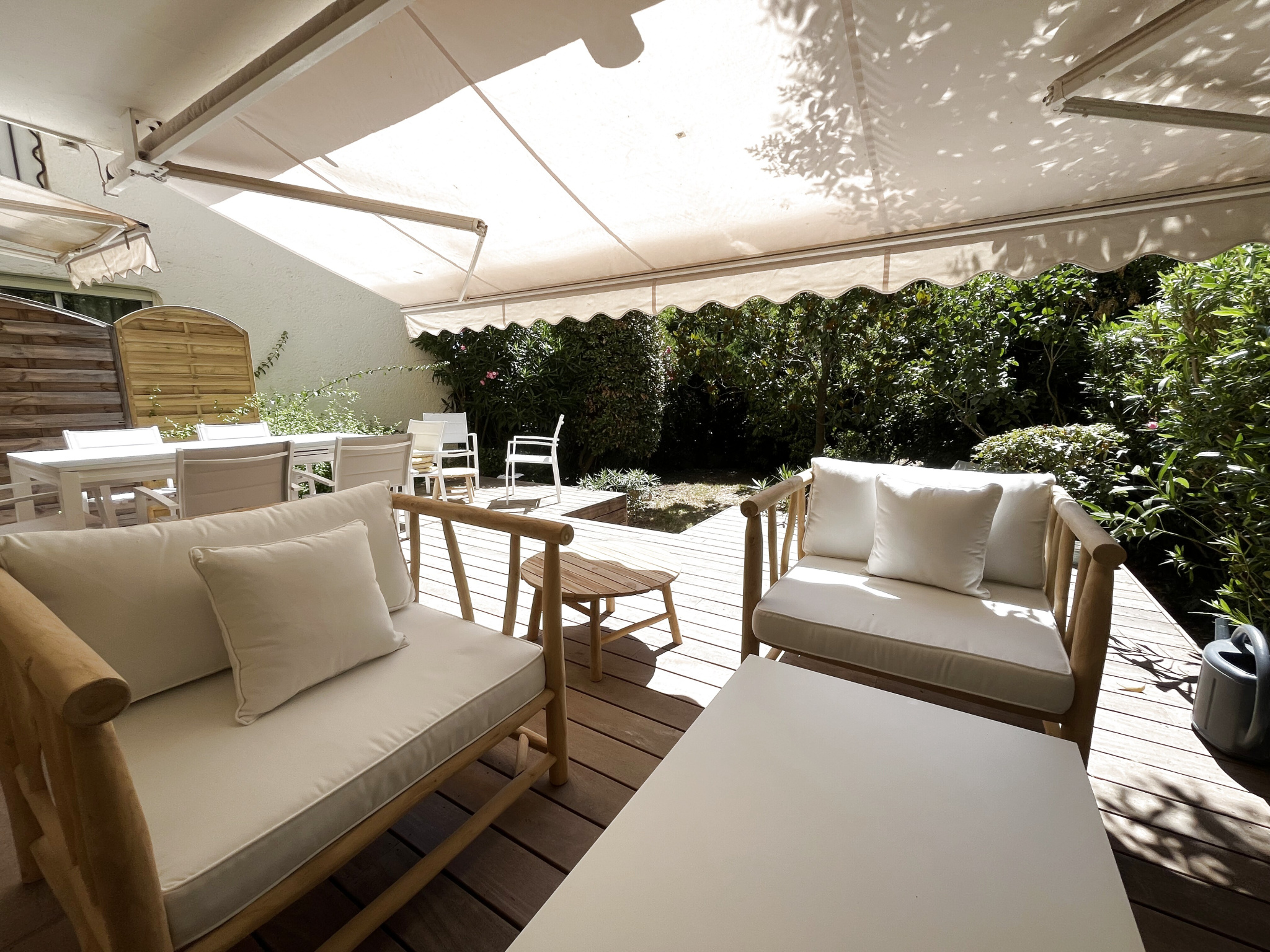 Au niveau RDC : d'un séjour lumineux avec une cuisine neuve américaine entièrement équipée avec cave à vins, salon/séjour, un WC invité. Une suite parentale avec placards et salle de douche avec wc. Le tout donnant sur un extérieur végétalisé au calme d'environ 100m2 comprenant une terrasse en bois de 40m2.