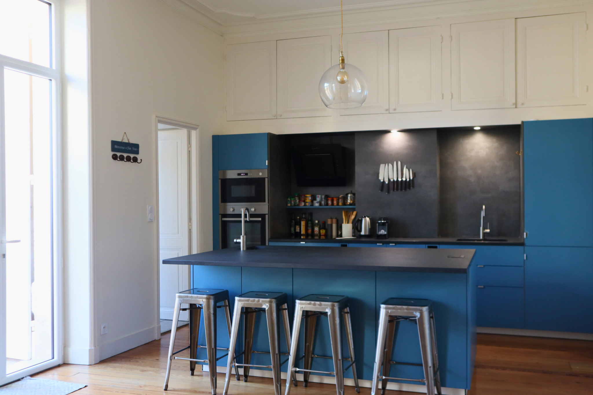 La cuisine contemporaine de 14,96 m2, parée d'éléments bleu tendance, est entièrement équipée avec des appareils haut de gamme (induction, four, micro-ondes, lave-vaisselle), une arrière-cuisine de 12,28 m2 (sol carrelé) et une buanderie de 8,10 m2 (sol carrelé).