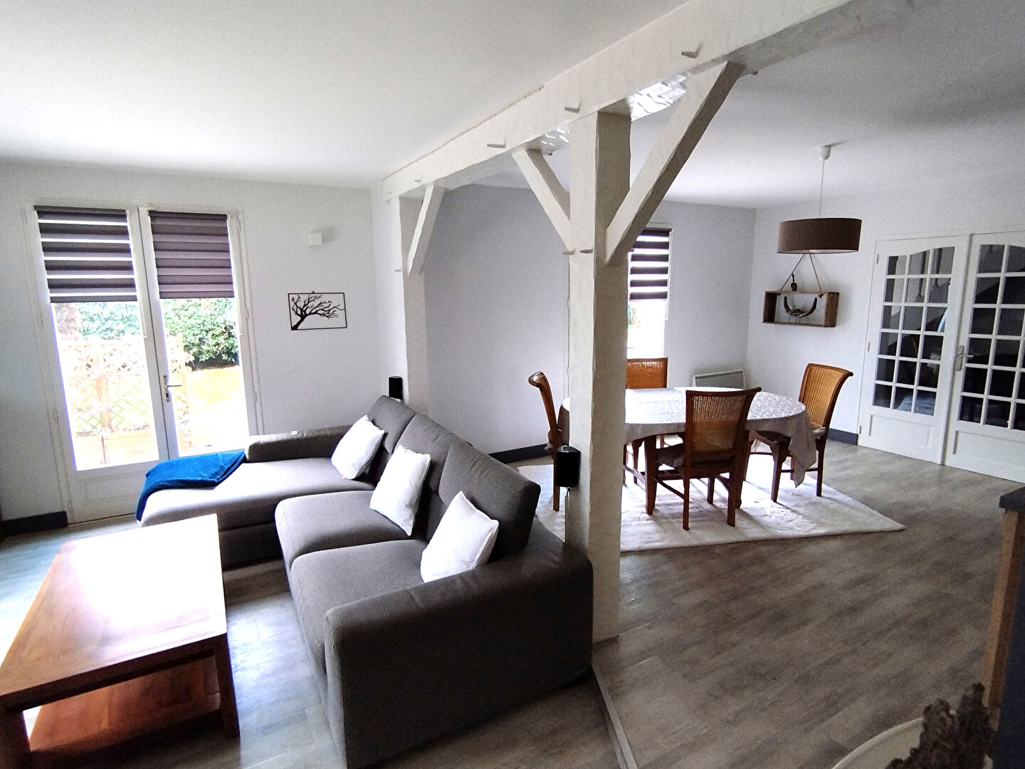 Bourg de Besné. Une maison comprenant au rdc une grande entrée qui dessert un salon séjour, une cuisine aménagée et équipée, une chambre, une salle de bains et un wc indépendant. A l'étage un palier desservant trois chambres dont une avec dressing, une salle de jeux, un débarras et une salle d'eau et un wc indépendant. Un garage attenant à la maison, un cabanon et un autre garage complètent le bien sur un terrain entièrement clôturé.