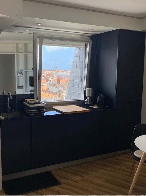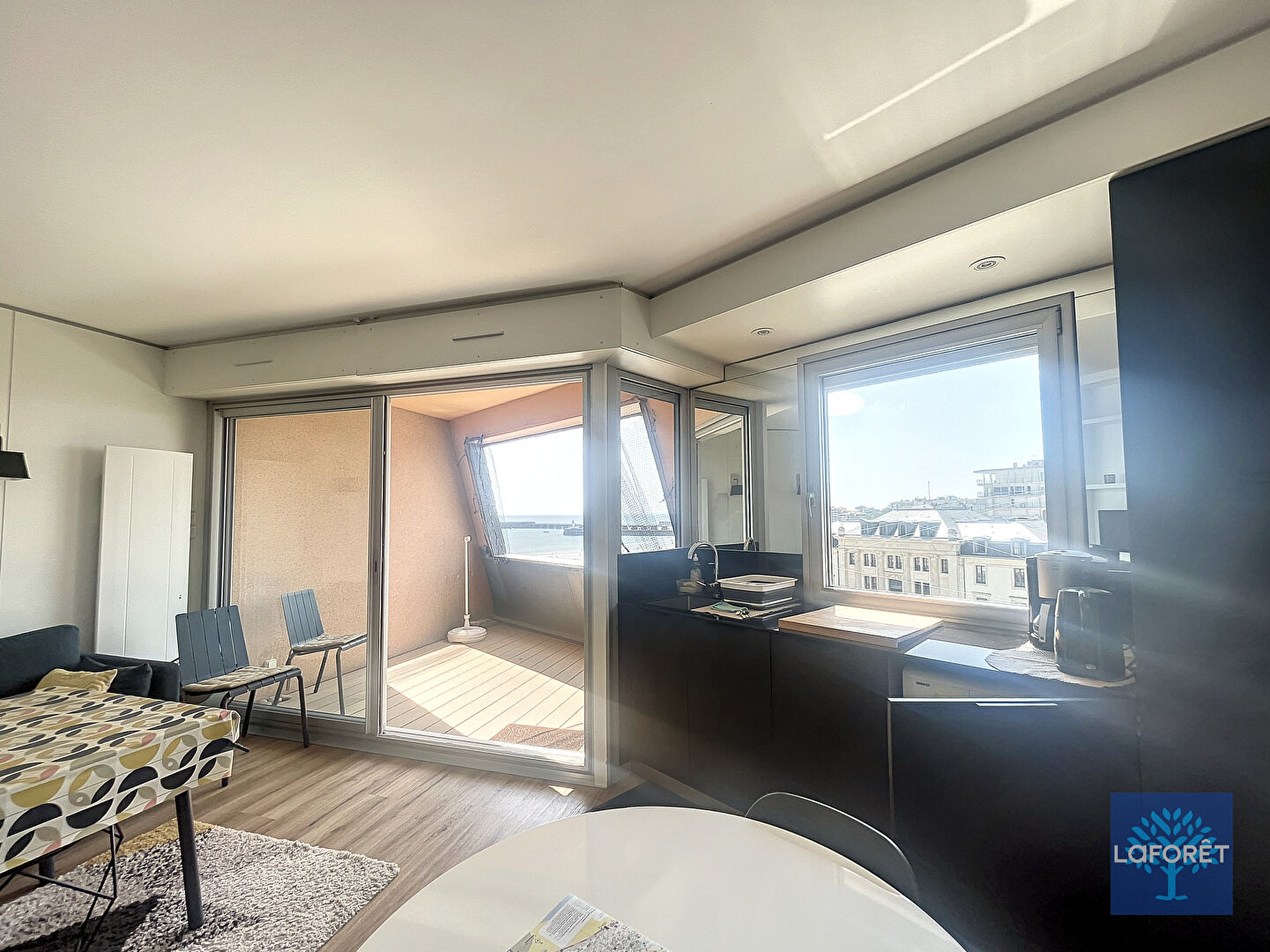 Offrant une superbe vue dégagée sur la mer et la ville, ce studio de 29,95 m² est situé au 4e et dernier étage avec ascenseur, à moins de 100 m de la grande plage et 200 m des rues piétonnes et du port de pêche. Il comprend une entrée, un séjour avec coin cuisine, un coin nuit, une salle d'eau, un WC indépendant, ainsi qu'une loggia avec vue mer.