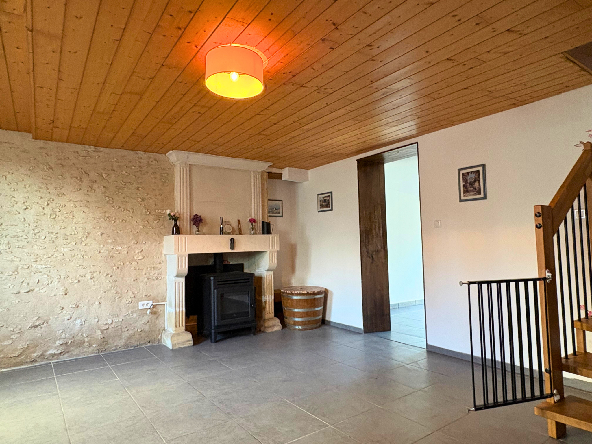 Au rez-de-chaussée, le salon de 28,21 m2 offre une atmosphère chaleureuse avec une cheminée en pierre et un poêle à granulés. La cuisine de 23,50 m2 aménagée, aux éléments blancs, est équipée d'une hotte et d'une plaque de cuisson quatre feux induction. Un couloir dessert une salle d'eau comprenant une douche à l'italienne, un wc et un lave-mains, ainsi qu'une chambre.