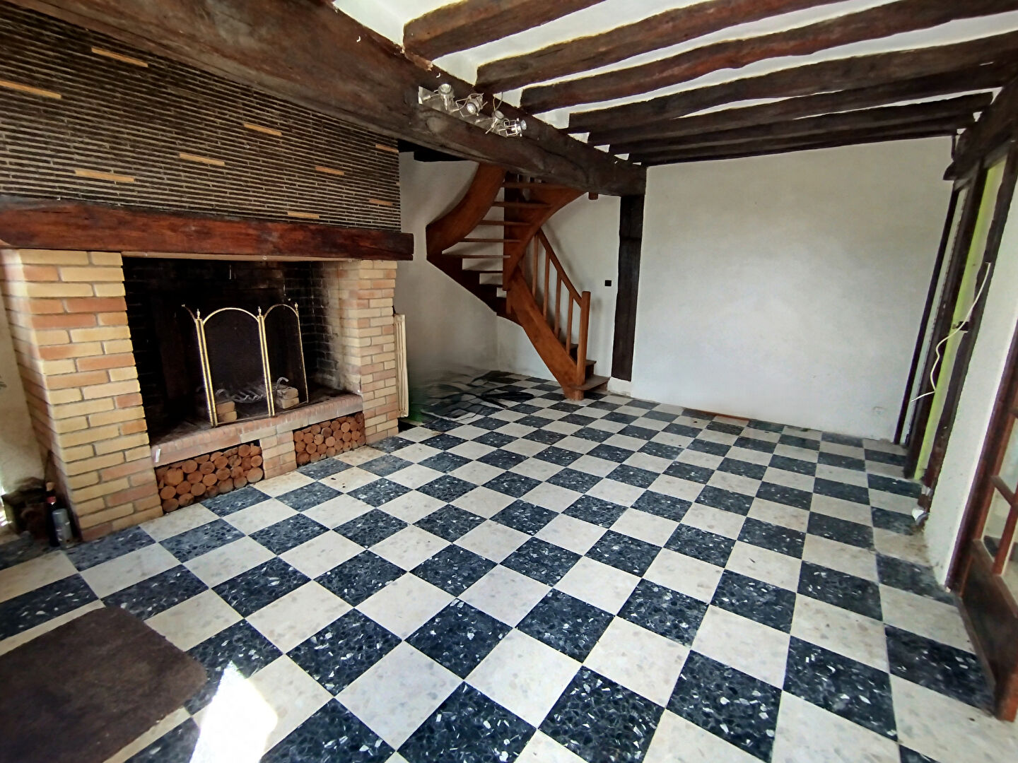 Entrée menant à un salon/séjour avec cheminée à foyer ouvert , créant une ambiance chaleureuse