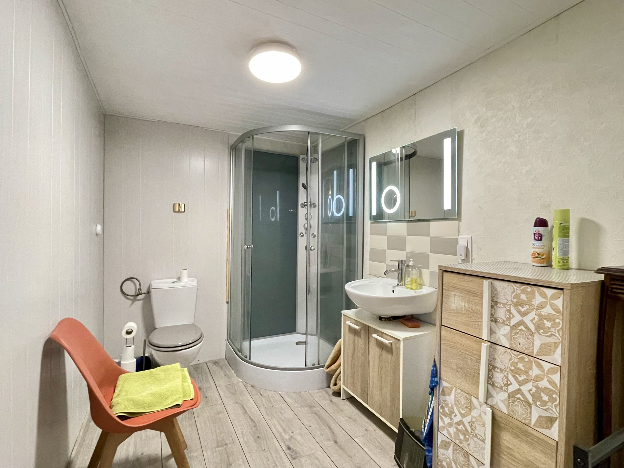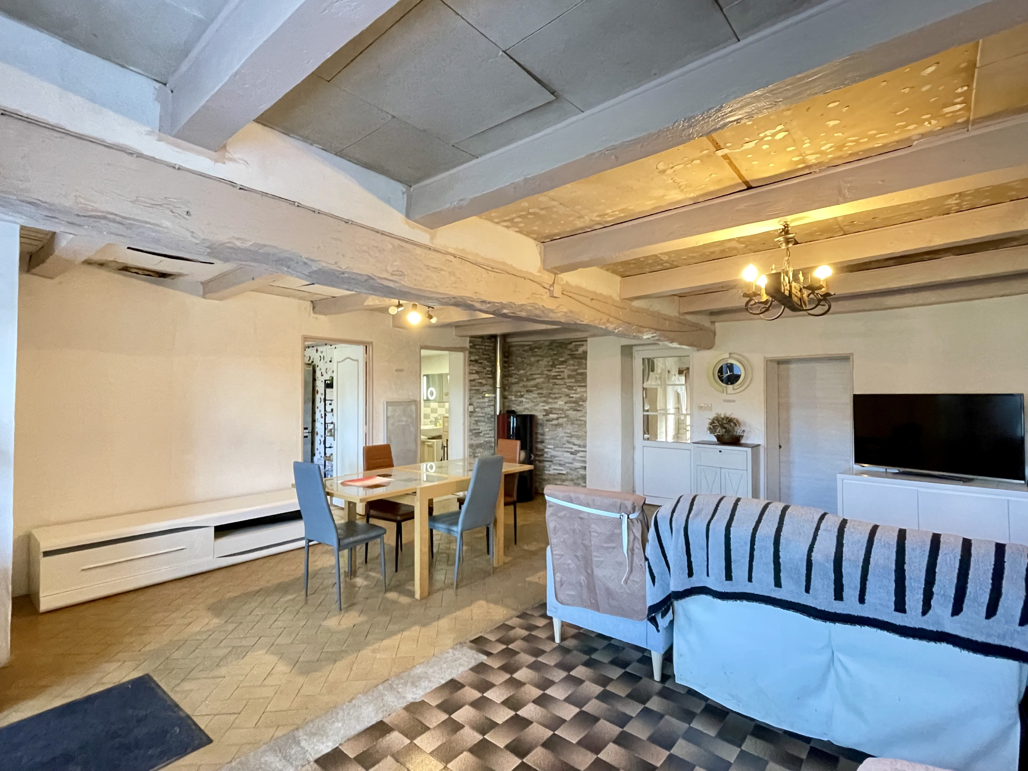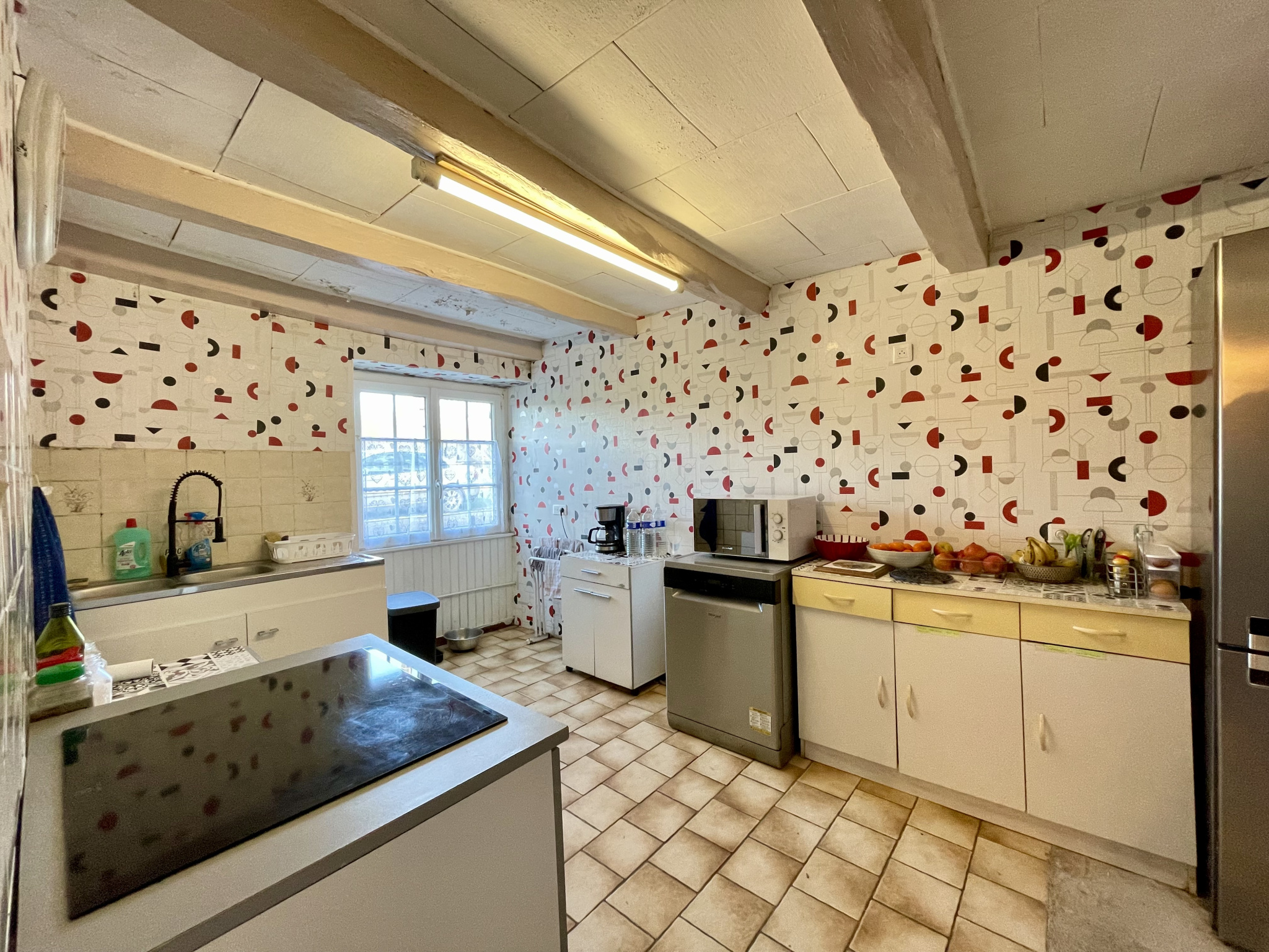 - Au rez-de-chaussée : Cuisine fonctionnelle, salon/séjour lumineux avec poêle à pellets, 1 chambre, salle d'eau avec wc, cuisine d'été de 8 m2 et remise de 15 m2.