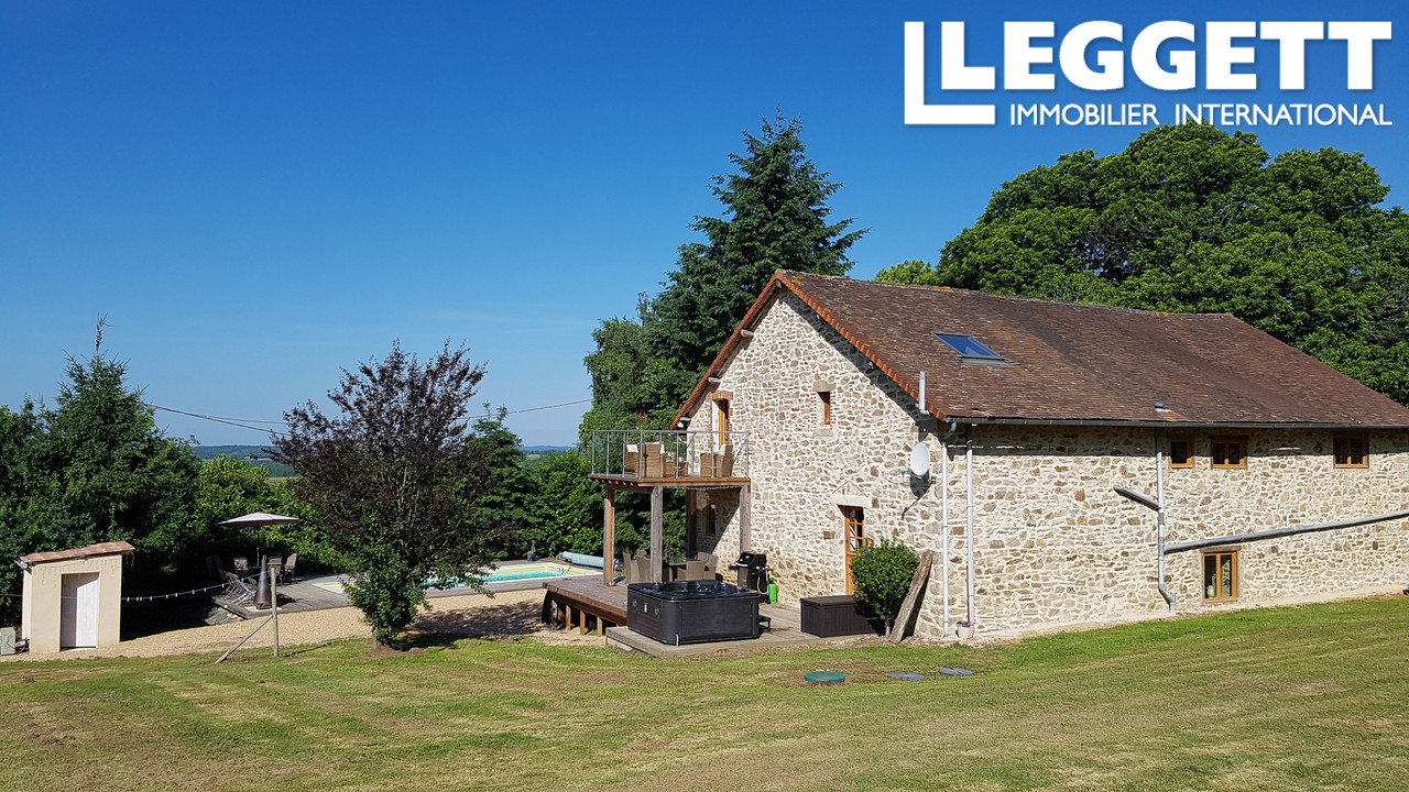 A23503WV87 - Superbe maison rénovée avec goût offrant 205 m² habitable et 8 pièces. Elle est nichée sur son terrain de 15 516 m², entouré de bois et de champs, avec vue imprenable sur la campagne Limousine. L'intérieur comprend au rez-de-chaussée une cuisine spacieuse et bien équipée, un salon avec poêle à bois et coin repas, une salle de jeux attenante et une salle d'eau. À l'étage, vous trouverez une chambre avec salle de bains privative, 3 autres chambres et 2 salles de bains. Dans un environnement privatif, profitez des vues panoramiques depuis l'étage et des loisirs avec une piscine chauffée, une terrasse et un balcon, complétés par un jacuzzi. Appréciez l'ambiance traditionnelle mise en valeur par des poutres et pierres apparentes, ainsi que les planchers en bois dur. Double vitrage, chauffage par radiateurs électriques, internet par fibre, fosse septique récente, cave et environnement paisible sans voisins à proximité.