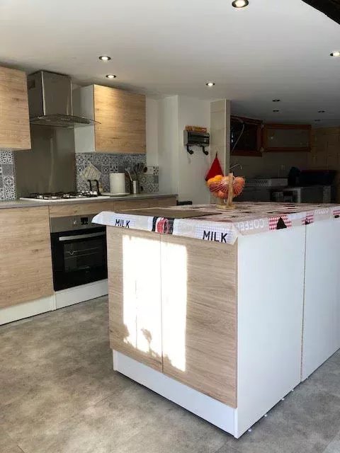 Elle se compose d’une grande cuisine indépendante, de sanitaires, ainsi que d’un vaste espace salon / séjour / salle à manger d’environ 35 m² agrémenté d’un poêle à bois, offrant une atmosphère chaleureuse et conviviale. La maison dispose également de trois chambres, d’une salle de douche avec WC et d’un bureau.