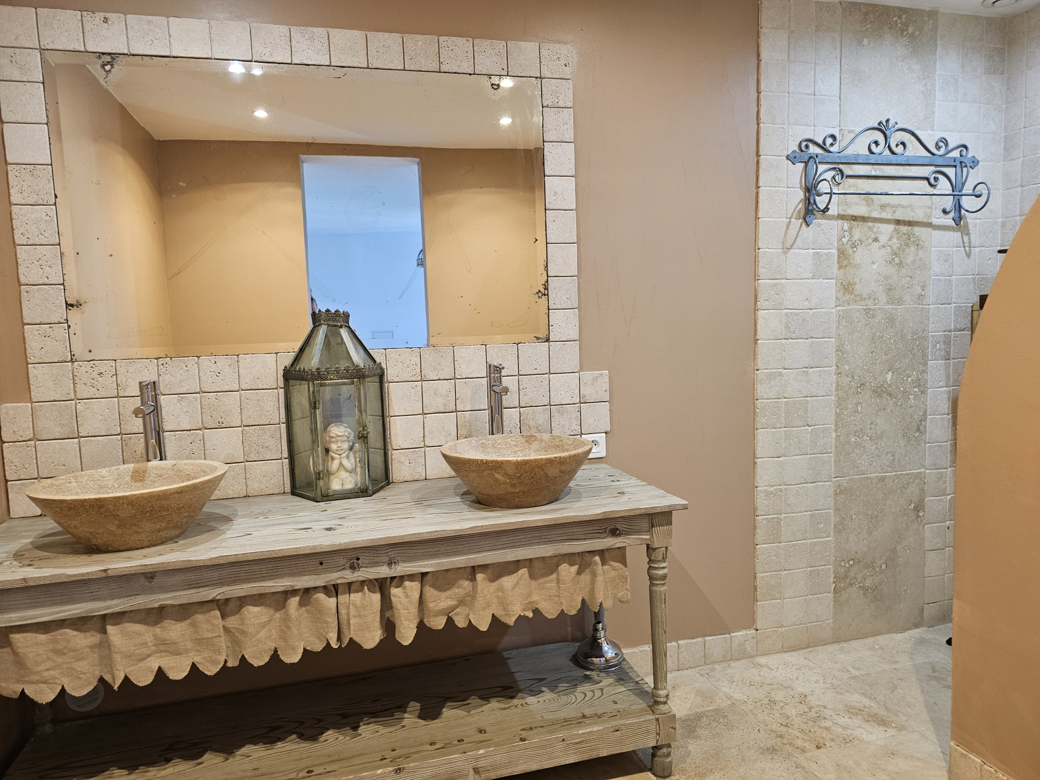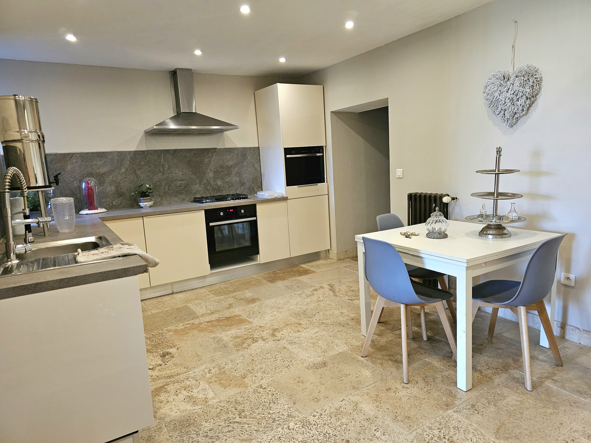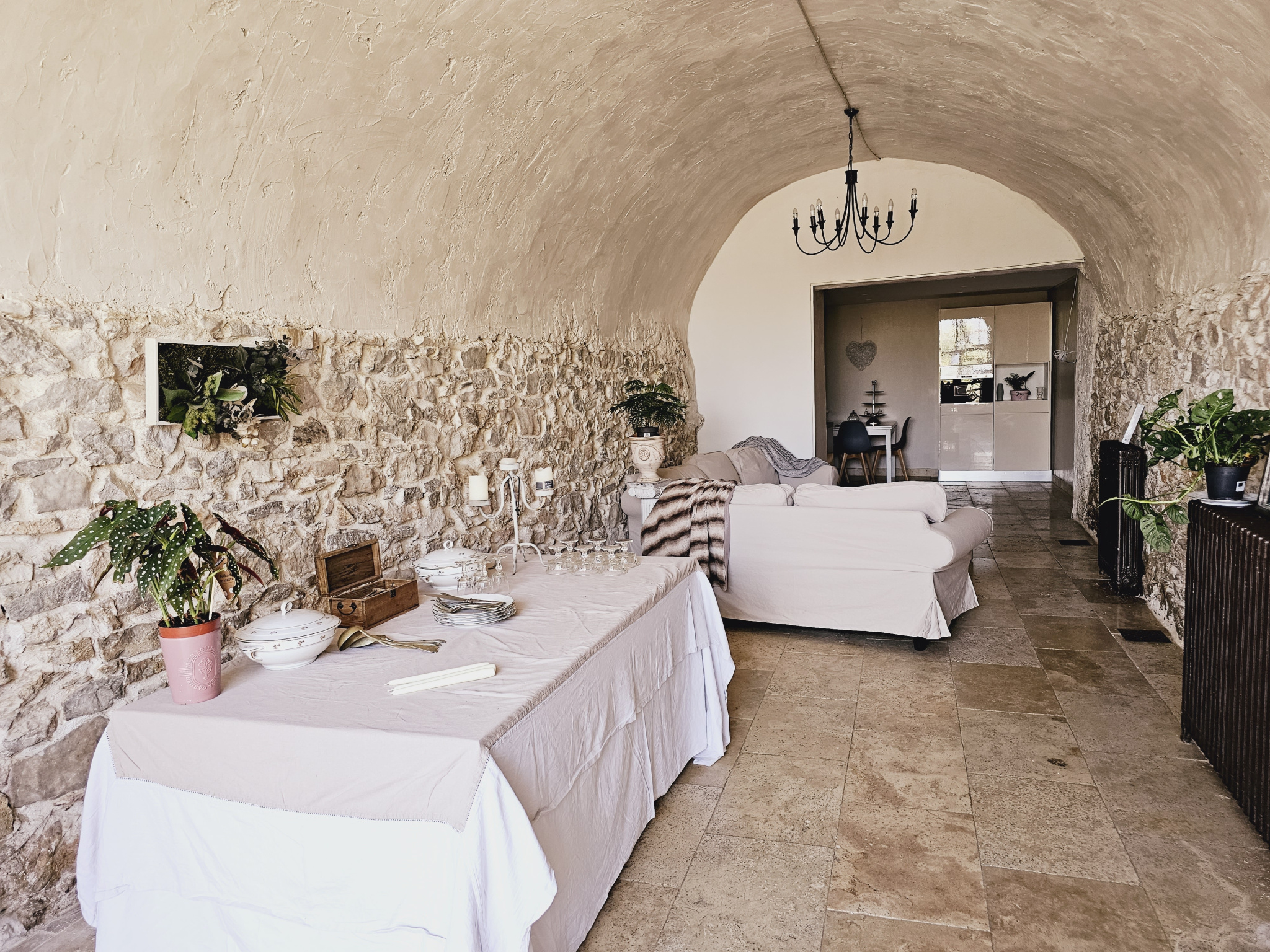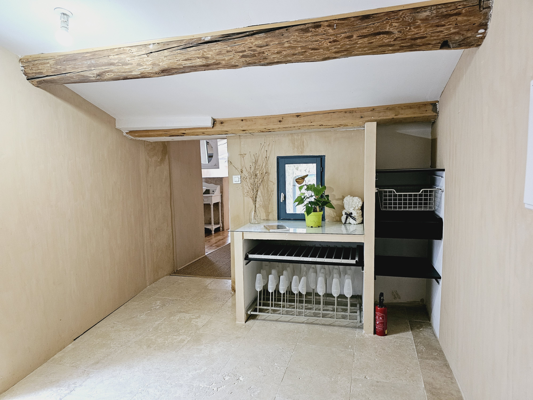 Une entrée avec buanderie et local technique, wc indépendant, une pièce de vie avec cuisine aménagée et équpée, une grande baie vitrée en fer forgé double vitrage, donnant accès à un petit extérieur, un escalier en fer forgé donnant un accès indépendant à une chambre. Travertin au sol, et plafond vouté en pierres apparentes.