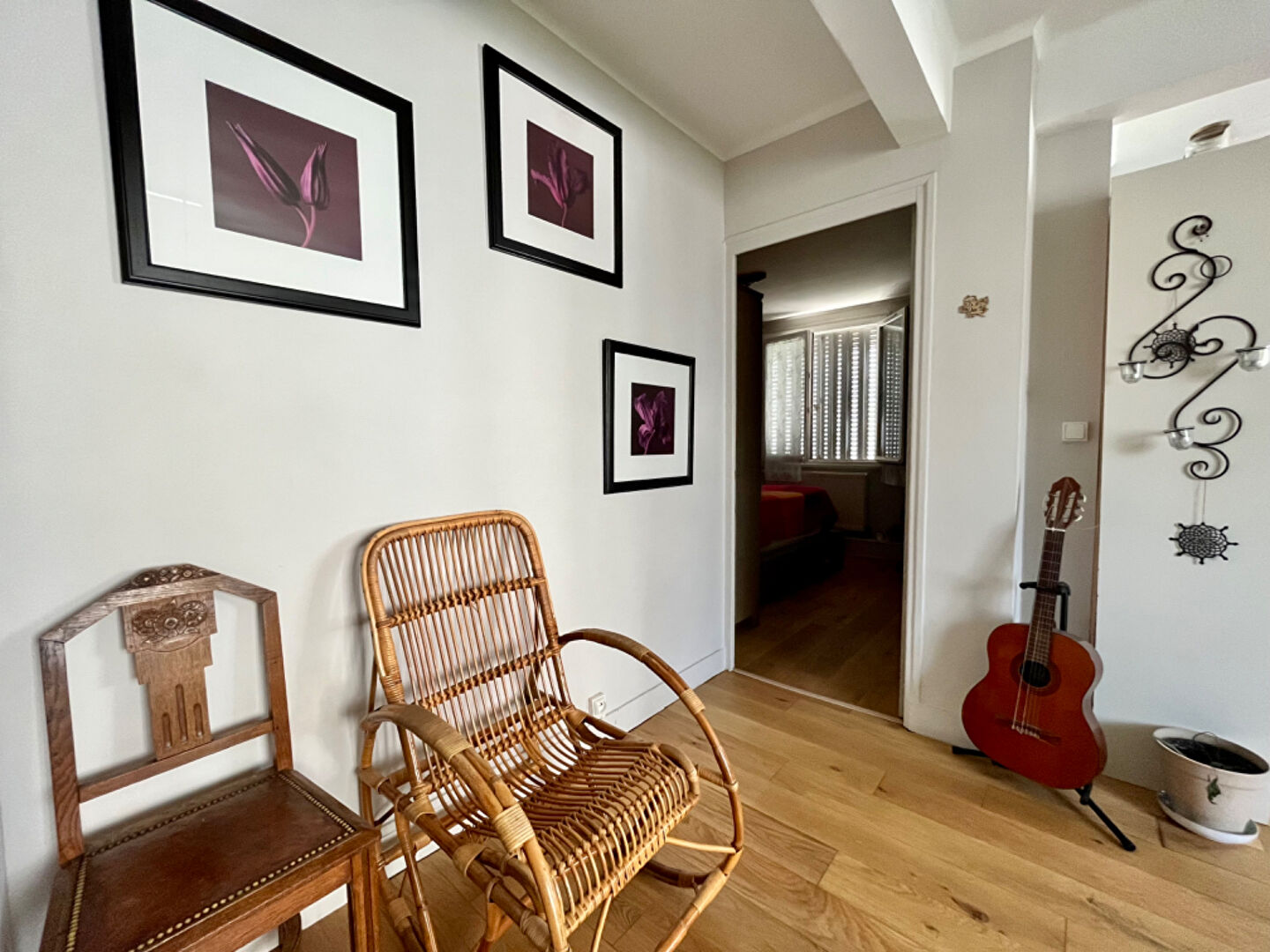T4 dans copropriété au calme entouré de verdure . Cet appartement dégage une sérénité avec son agencement , décoration , et de son parquet au niveau de la pièce principale et des deux chambres . Chauffage individuel gaz . Place de parking collective . Cave et grenier .