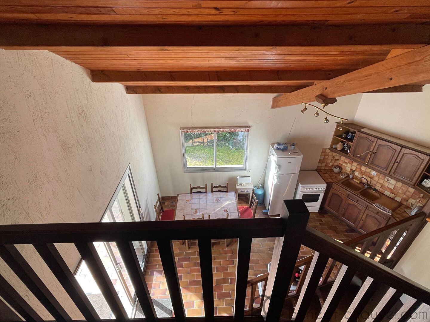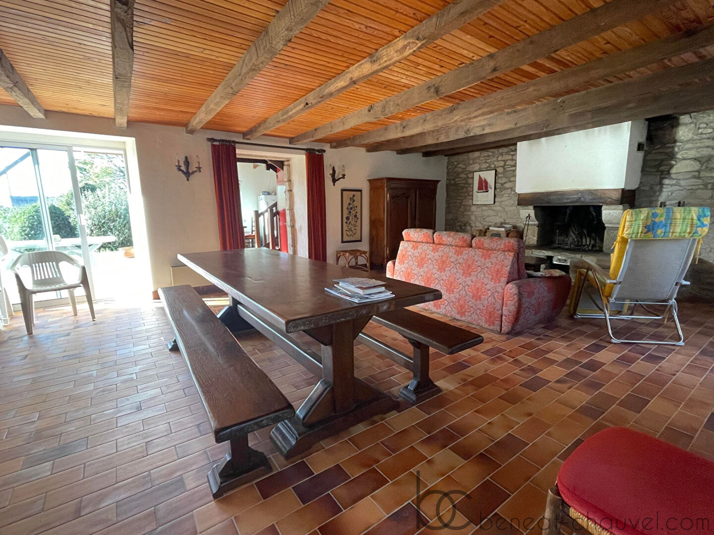 Au rez-de-chaussée : Spacieux salon/séjour avec cheminée et cuisine donnant sur terrasse.
