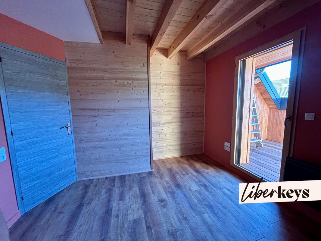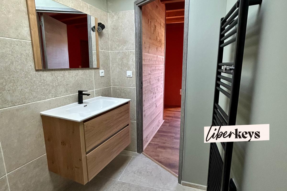L'appartement, complètement neuf, propose une cuisine équipée ouverte sur le séjour, une grande chambre (sol parquet) proposant l'accès à la salle de bain ainsi qu'aux sanitaires.