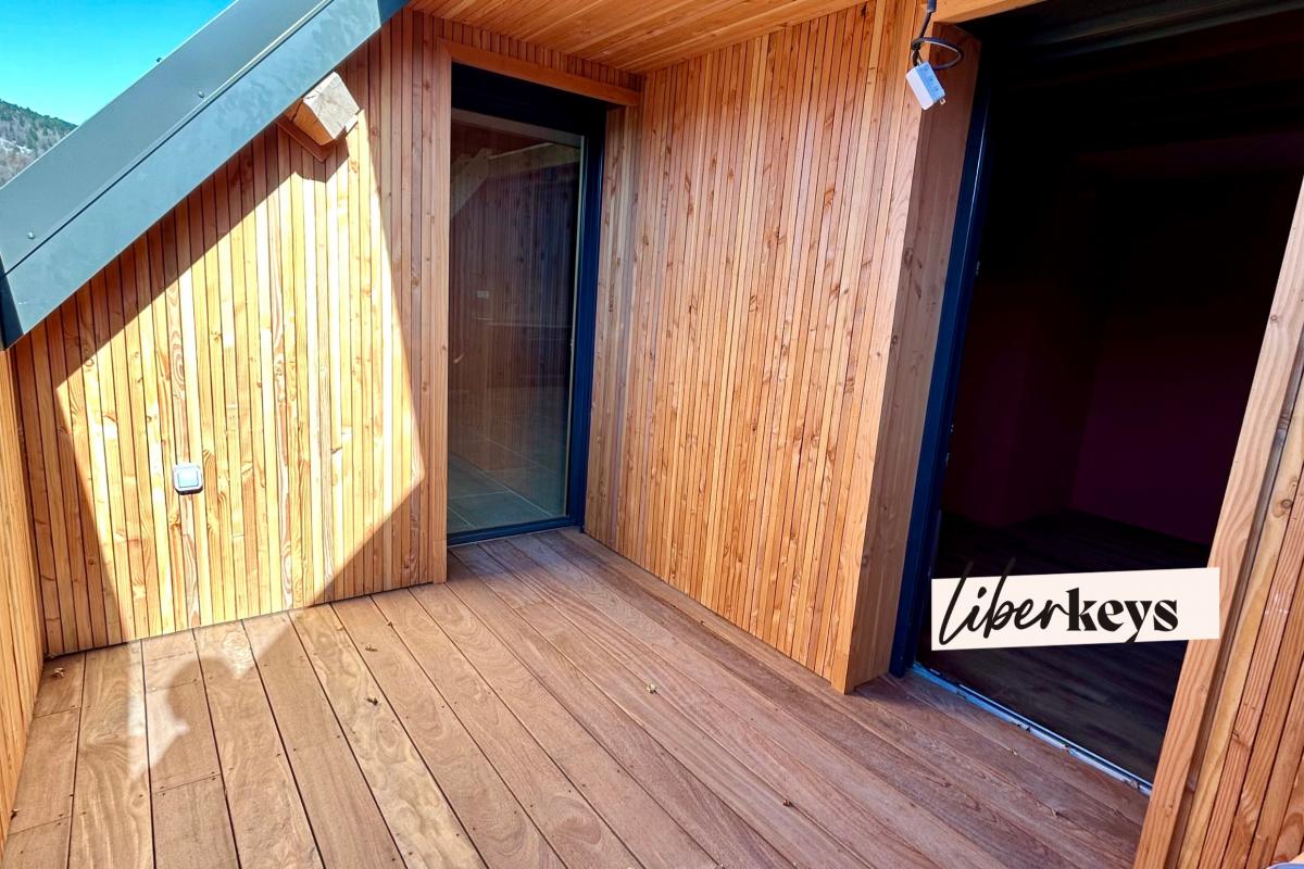 La terrasse, exposée plein sud et sans vis-à vis, est accessible depuis la pièce à vivre ainsi que depuis la chambre.