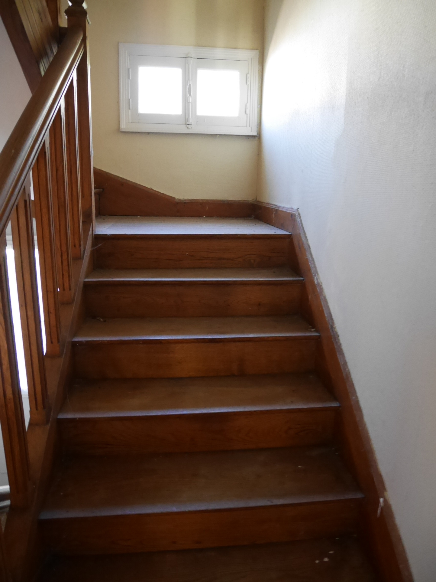 Escalier menant au dernier étage composé de trois pièces mansardées et de deux greniers.