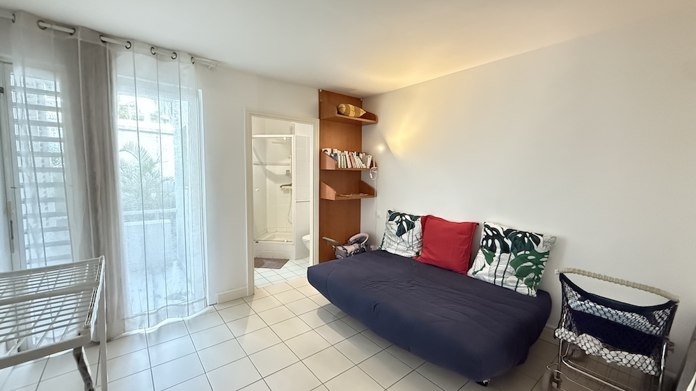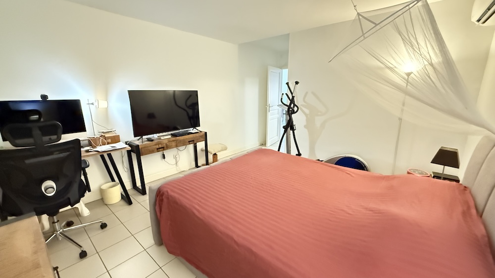 L'appartement est composé d'un grand séjour avec climatisation et brasseurs d'air, une cuisine aménagée (entirèrement refaite l'an dernier), une grande terrasse couverte prolongée par un deck neuf, une suite parentale climatisée avec grand placard, salle d'eau et WC, 2 autres chambres climatisées avec placard et chacune leur salle d'eau et leur petit balcon, une 4ème chambre avec sa salle d'eau, et enfin un WC indépendant avec lave-mains. Volets roulants électriques dans chaque pièce.