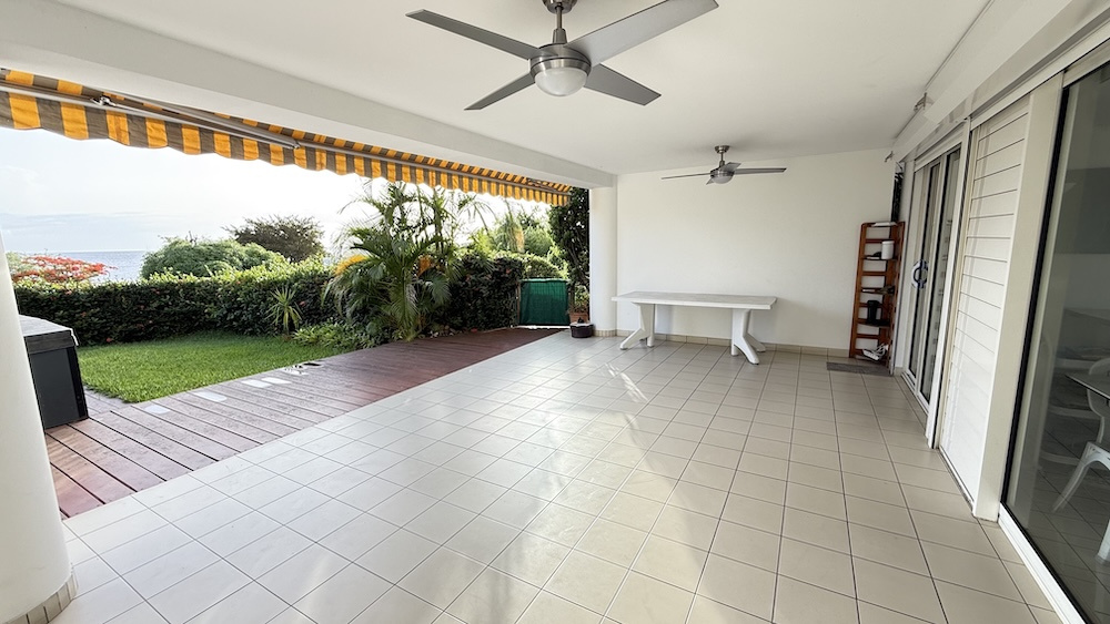 La terrasse, avec splendide vue mer, donne sur un jardin clôturé privatif d'environ 100 m2, qui permet l'accès à un grand parc très bien entretenu par la copropriété, sur lequel un carbet permet de profiter de la vue mer.