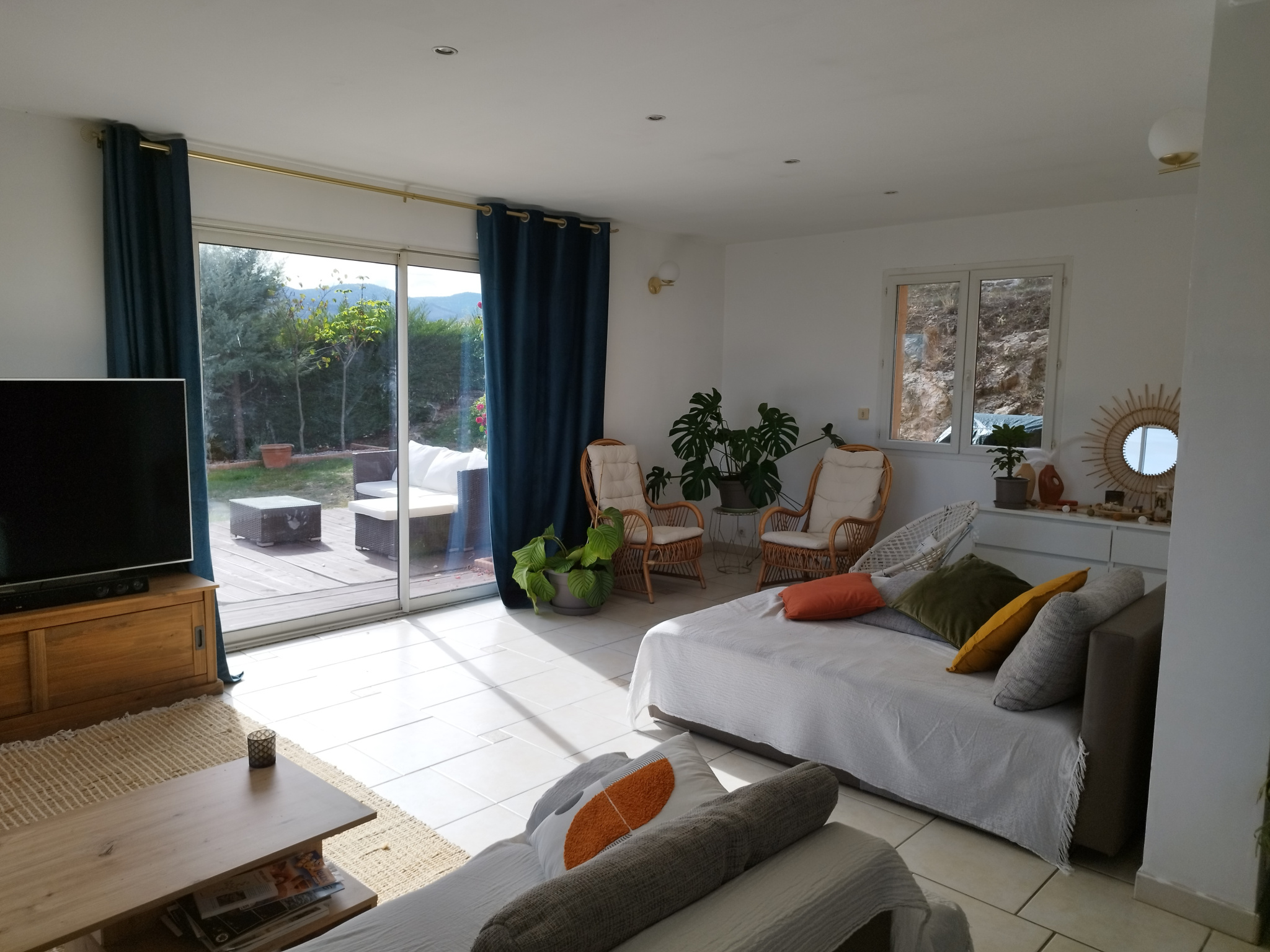Elle se compose, au premier niveau, d'une grande pièce de vie baignée de lumière avec une cuisine ouverte équipée, des accès directs au jardin et sa terrasse, d'une pièce bureau ou chambre, d'un WC indépendant avec lave-main puis d'une buanderie avec point-d 'eau et accès au garage (50m2) attenant à la maison.