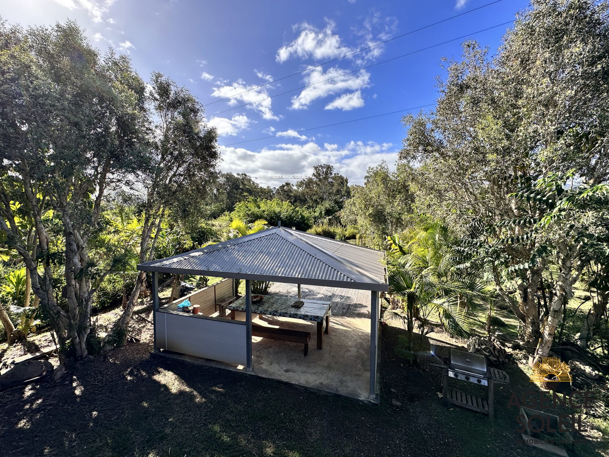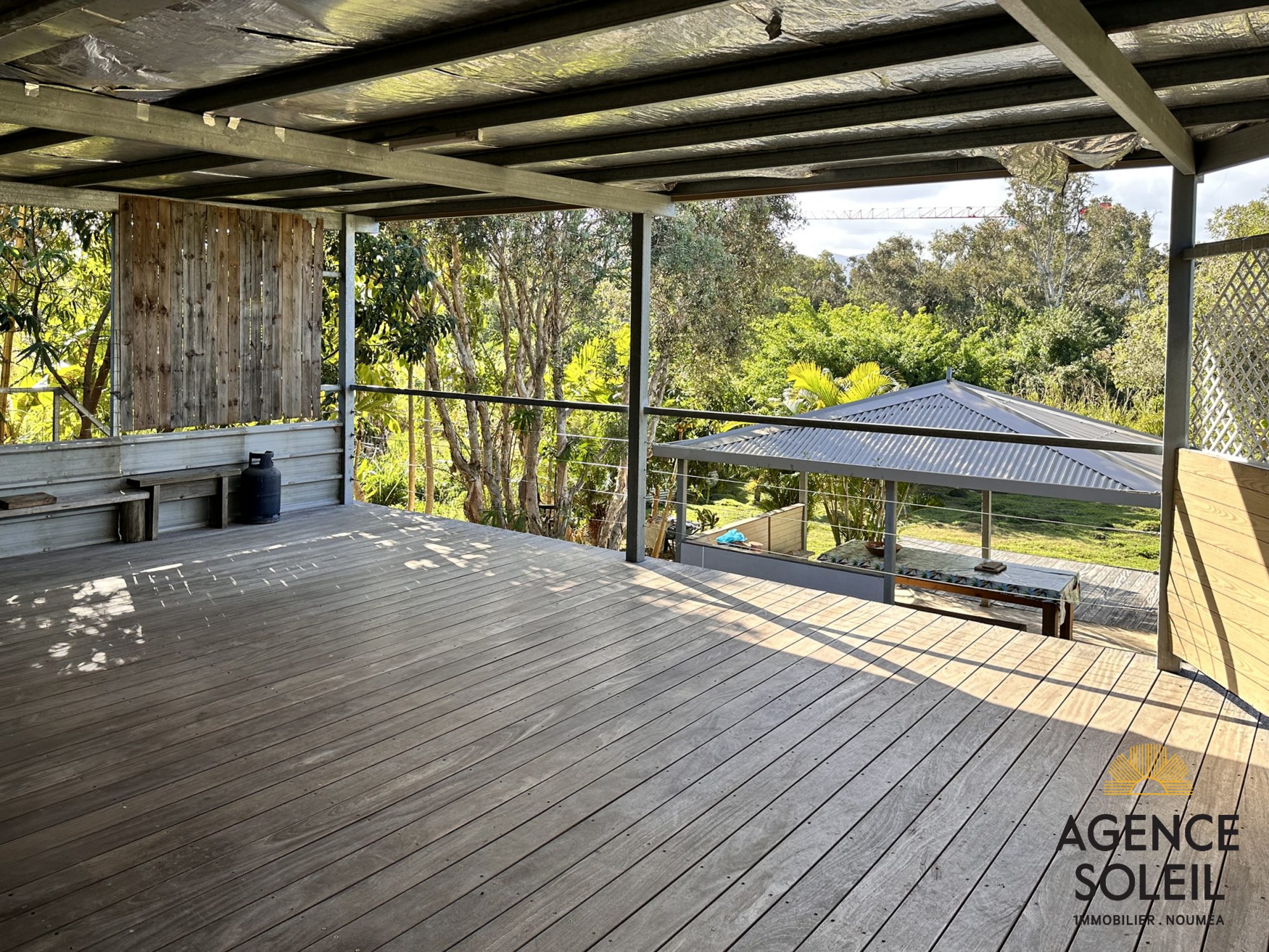 Le séjour ouvre sur une belle terrasse couverte de 20 m² prolongée par un deck également couvert de 40 m². Faré de 20 m².