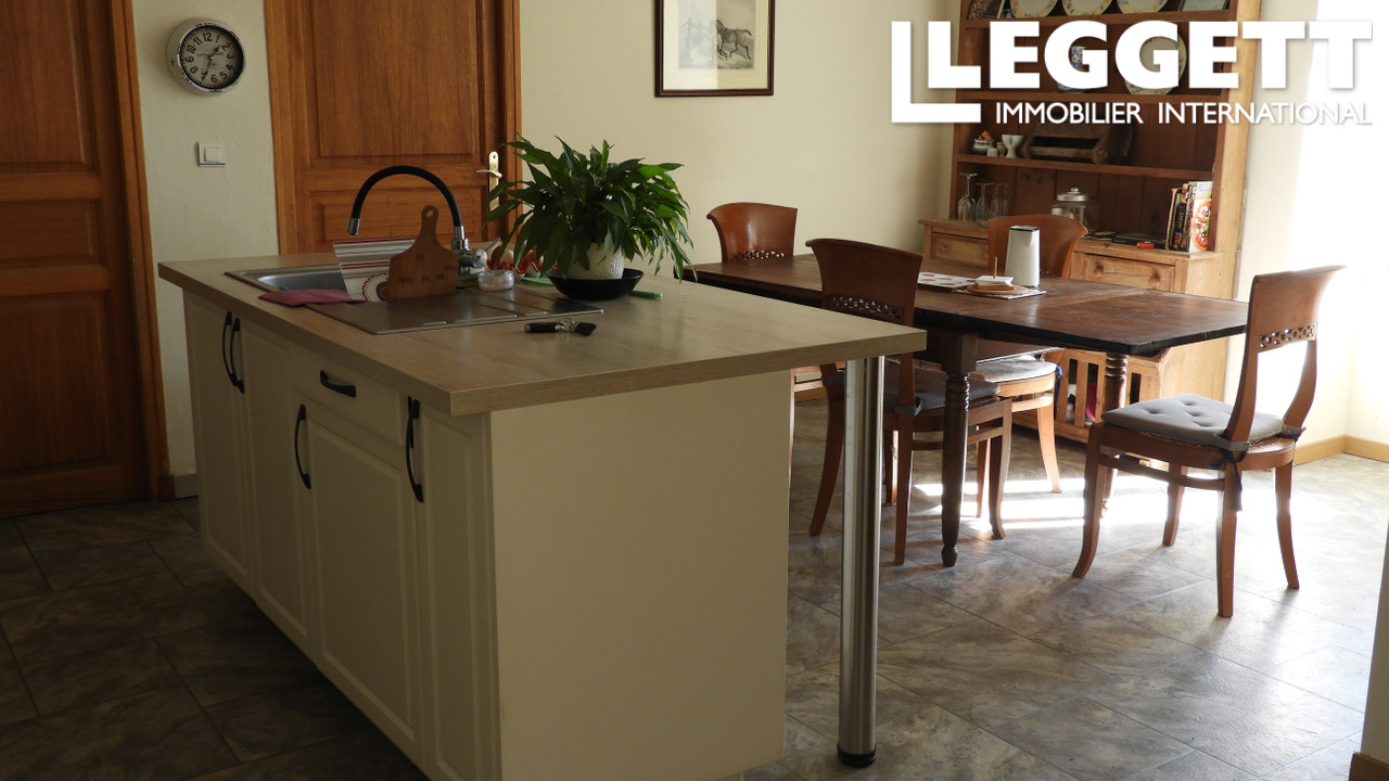 A17363 - Ferme avec maison de 5 chambres : entrée, cuisine ouverte, salle à manger/salon avec les portes-fenêtre donnant accès au jardin, buanderie, 2 chambres, salle de bains (douche) toilette, chaufferie / 2e buanderie, cave sous la cuisine.