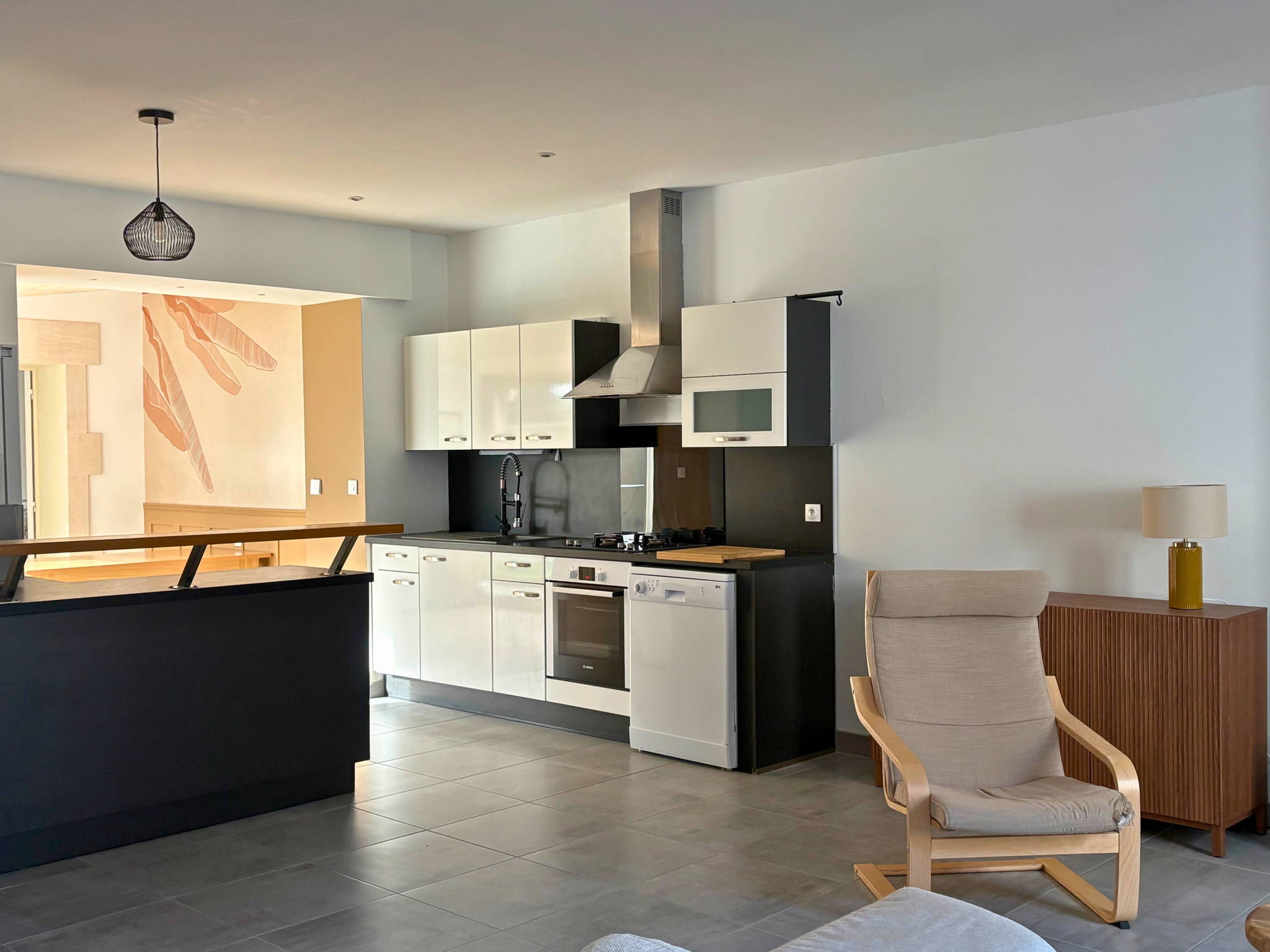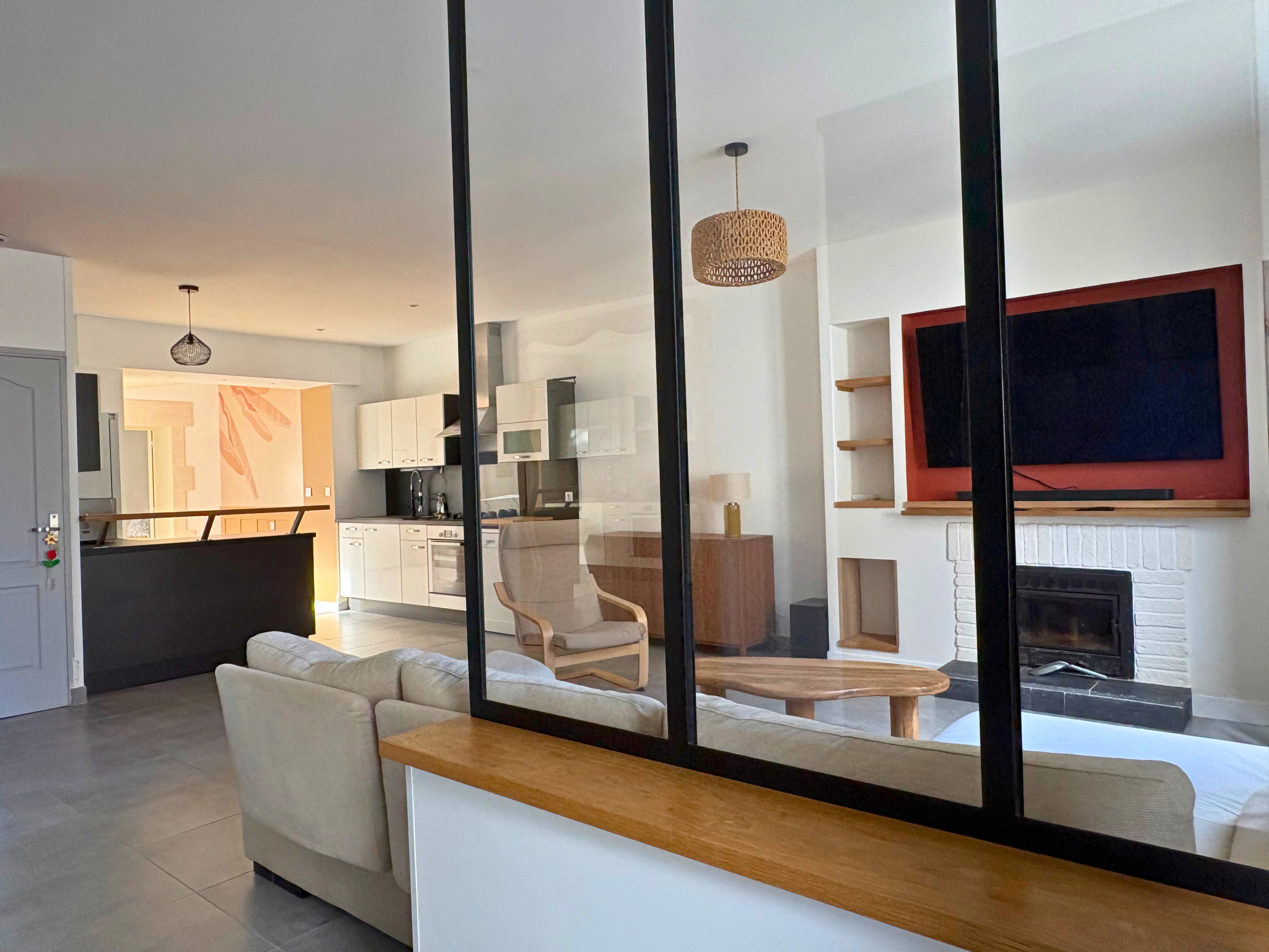 L'entrée avec placard s'ouvre directement sur un séjour lumineux de 39,38 m2, prolongé par une cuisine à l'américaine aménagée avec des éléments laqués blancs et équipée d'une hotte, d'une plaque de cuisson quatre feux gaz de ville et d'un four. Cet espace de vie se prolonge vers une salle à manger conviviale de 9,83 m2.
