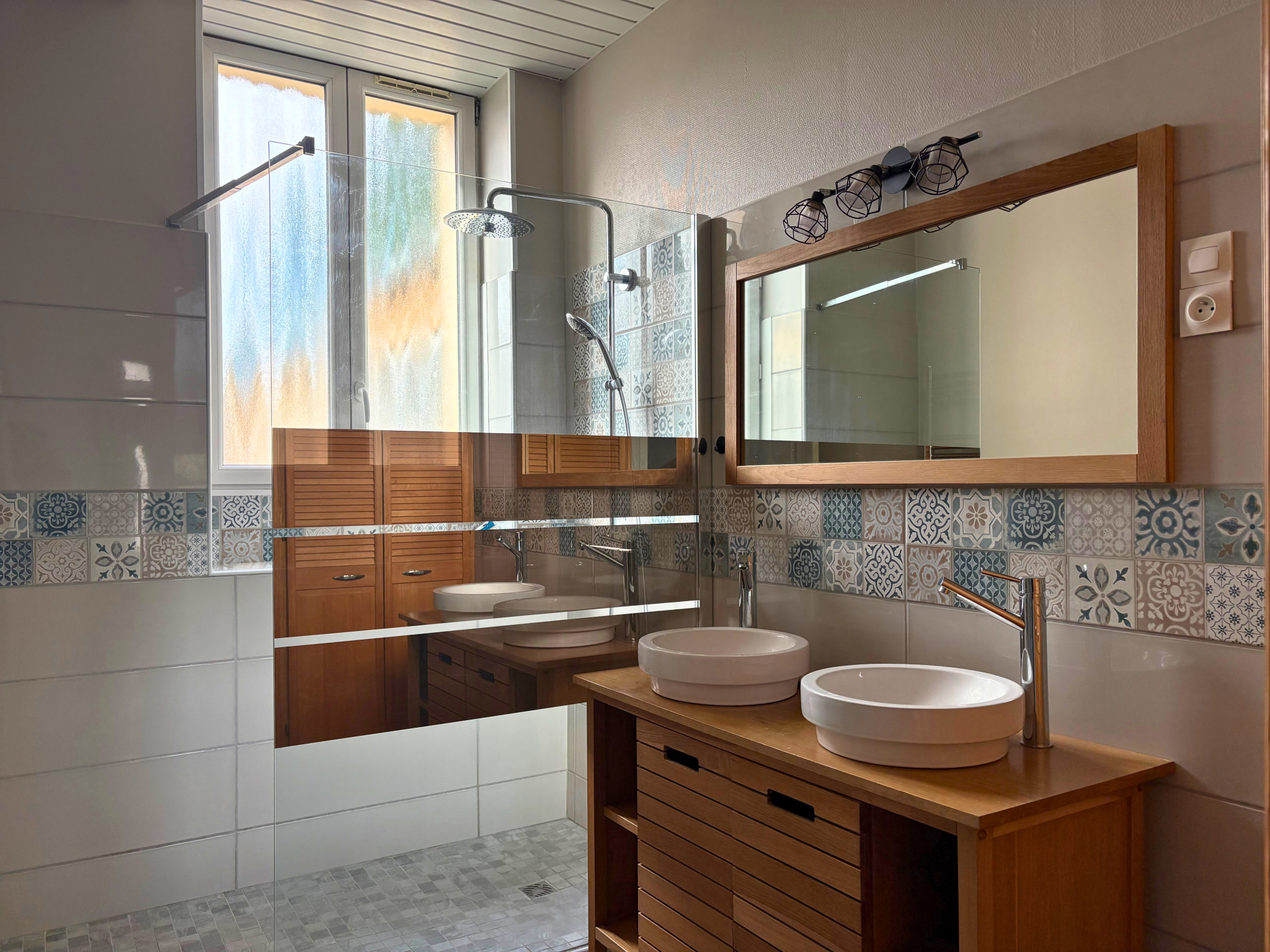 La partie nuit comprend deux chambres de 12,91 m2 et 12,55 m2 avec placard, ainsi qu'une troisième chambre de 10,05 m2 faisant office de chambre ou de remise selon les besoins. Une salle d'eau moderne de 5,78 m2 est composée d'un meuble deux vasques, d'une douche à l'italienne et d'un placard. Un wc indépendant de 1,96 m2 complète l'ensemble.