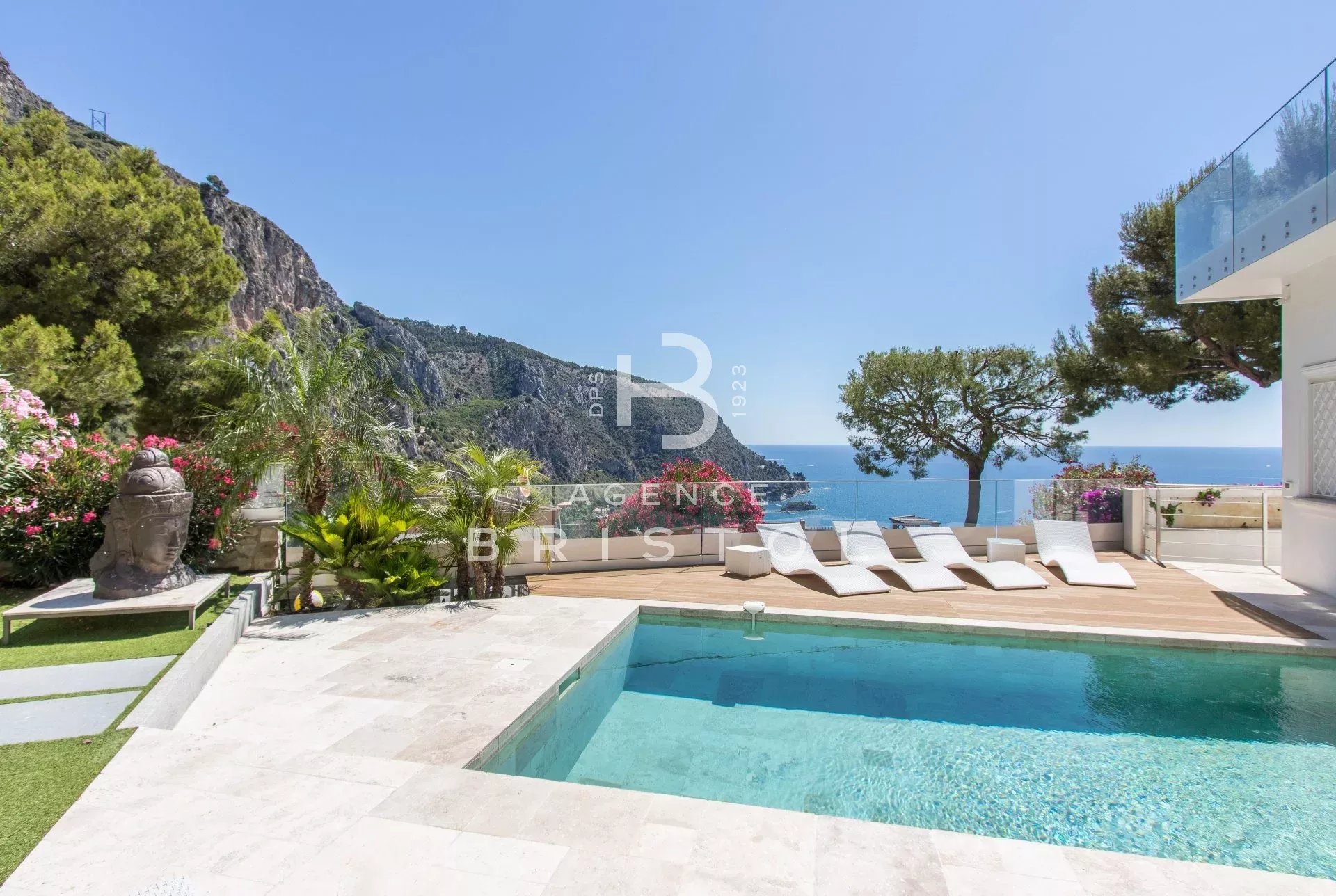 Eze bord de mer, très belle villa moderne située au calme et bénéficiant d’une jolie vue mer. Cette villa de charme aux beaux volumes est en très bon état, sa surface habitable est répartie comme suit sur deux niveaux :