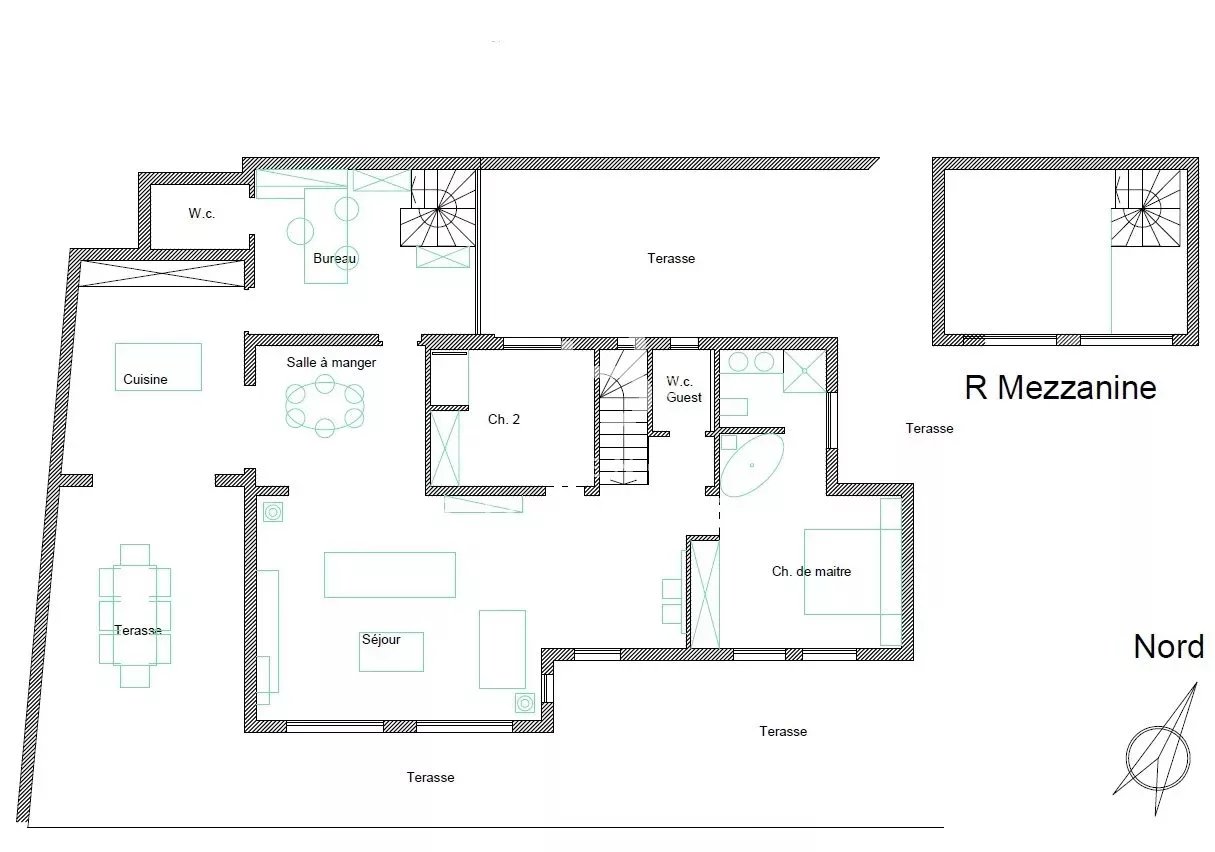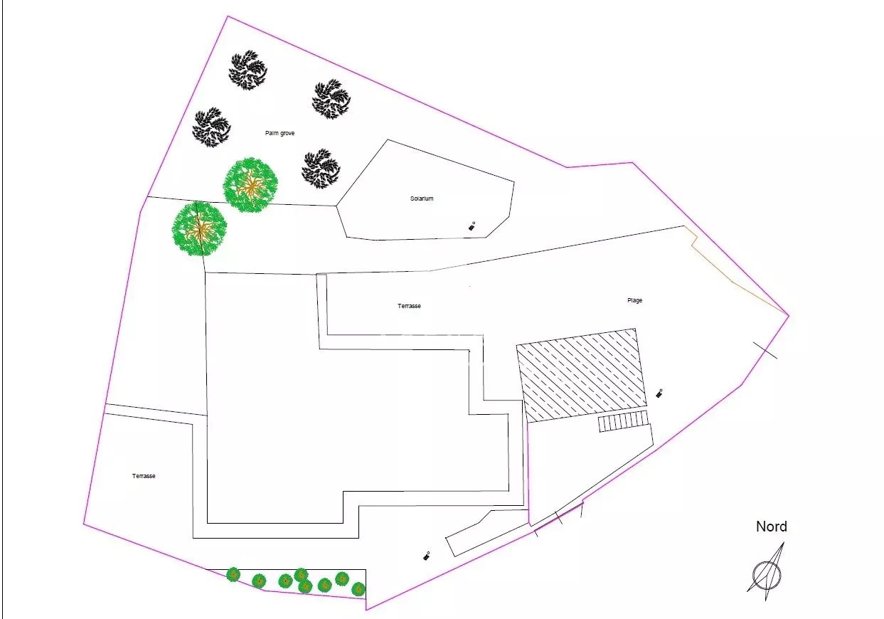 - au niveau principal: un grand living room avec salle à manger et cuisine indépendante, chambre de maître avec salle de bains en suite, le tout donnant sur la terrasse face à la mer; une chambre avec douche. Jouxtant la salle à manger, un bureau offrant l’accès à une chambre en mezzanine et au patio intérieur; sur ce même plan est située la piscine avec larges terrasses tout autour et vue mer.