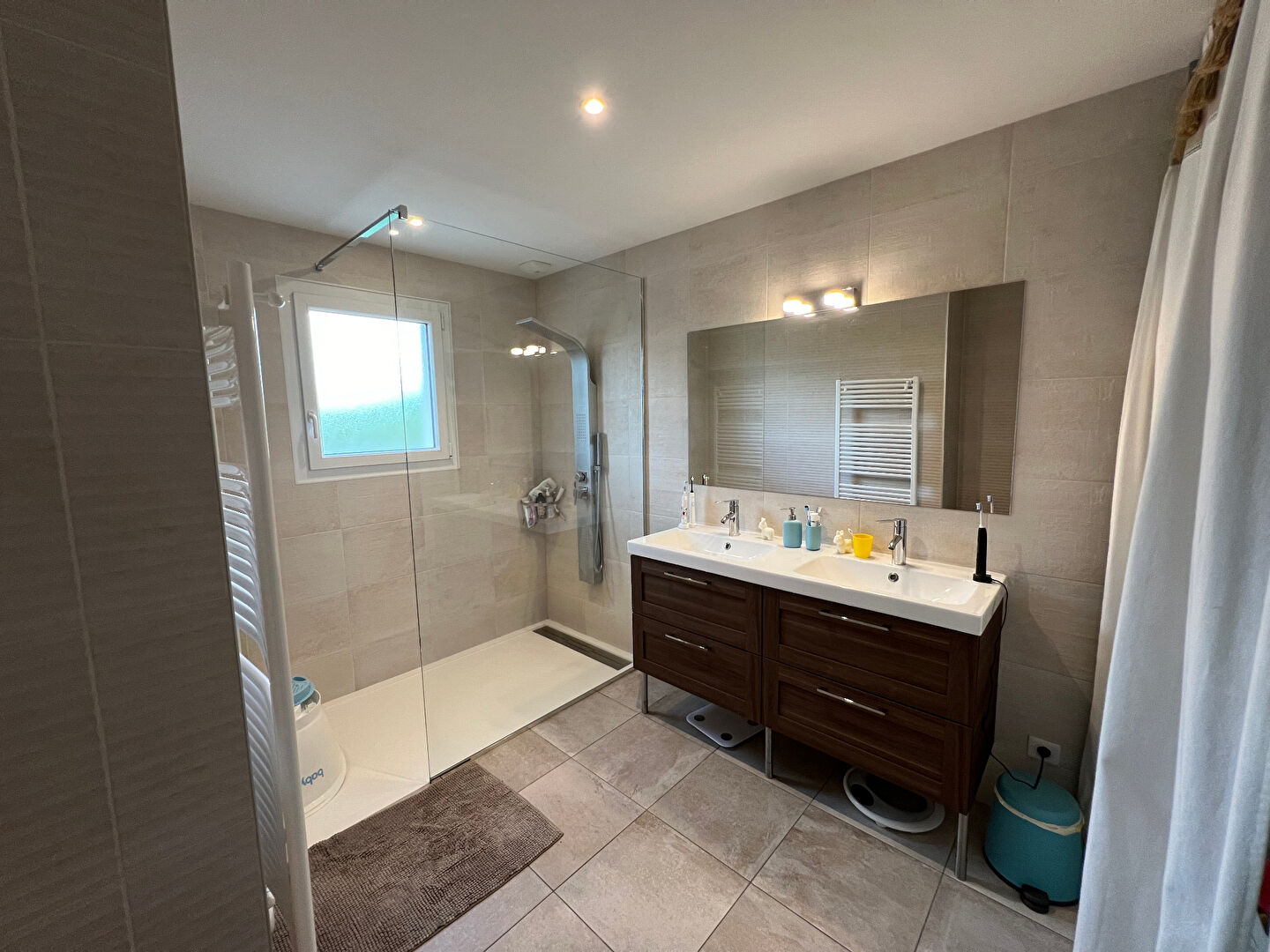 Maison récente RT 2012 dans un environnement très calme . Très bien entretenue aussi bien intérieur qu'extérieur . Cuisine équipée de 10,27 m2 ouverte sur salon séjour d'environ 43 m2 donnant accès sur terrasse recouverte d'une pergola bio climatique très agréable pour vos journées et soirées d'été et sans trop de vis à vis . Le plus de cette maison une chambre en rdc avec sa salle d'eau privative .
