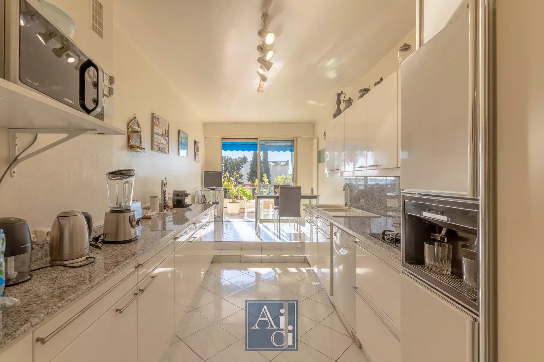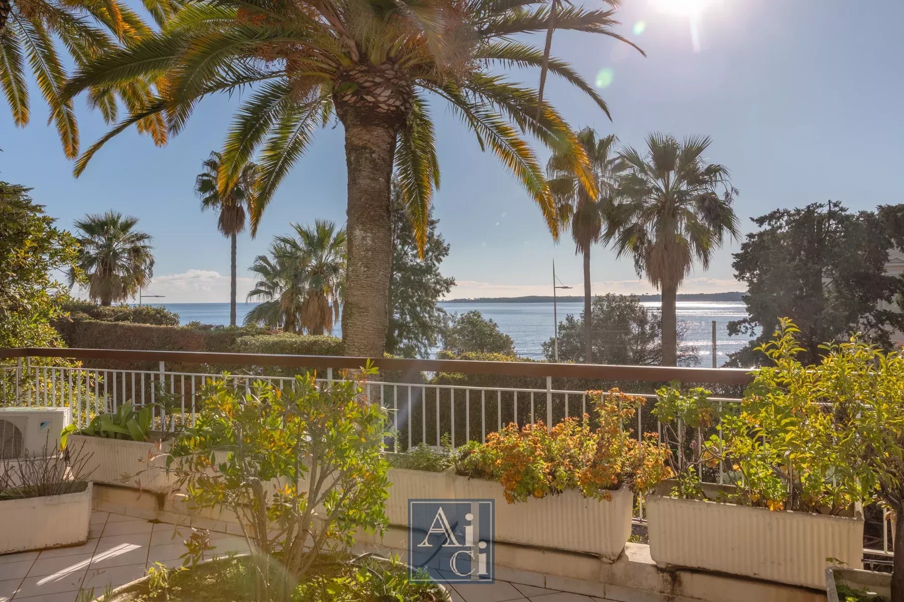 A vendre : Spacieux appartement 3 pièces à Cannes Basse Californie, à 5 minutes des plages et commerces. 106?m² + terrasse sud de 100?m² avec vue mer. Séjour, cuisine fermée, 2 chambres. Résidence sécurisée avec gardien. Garage et cave inclus. Travaux à prévoir.